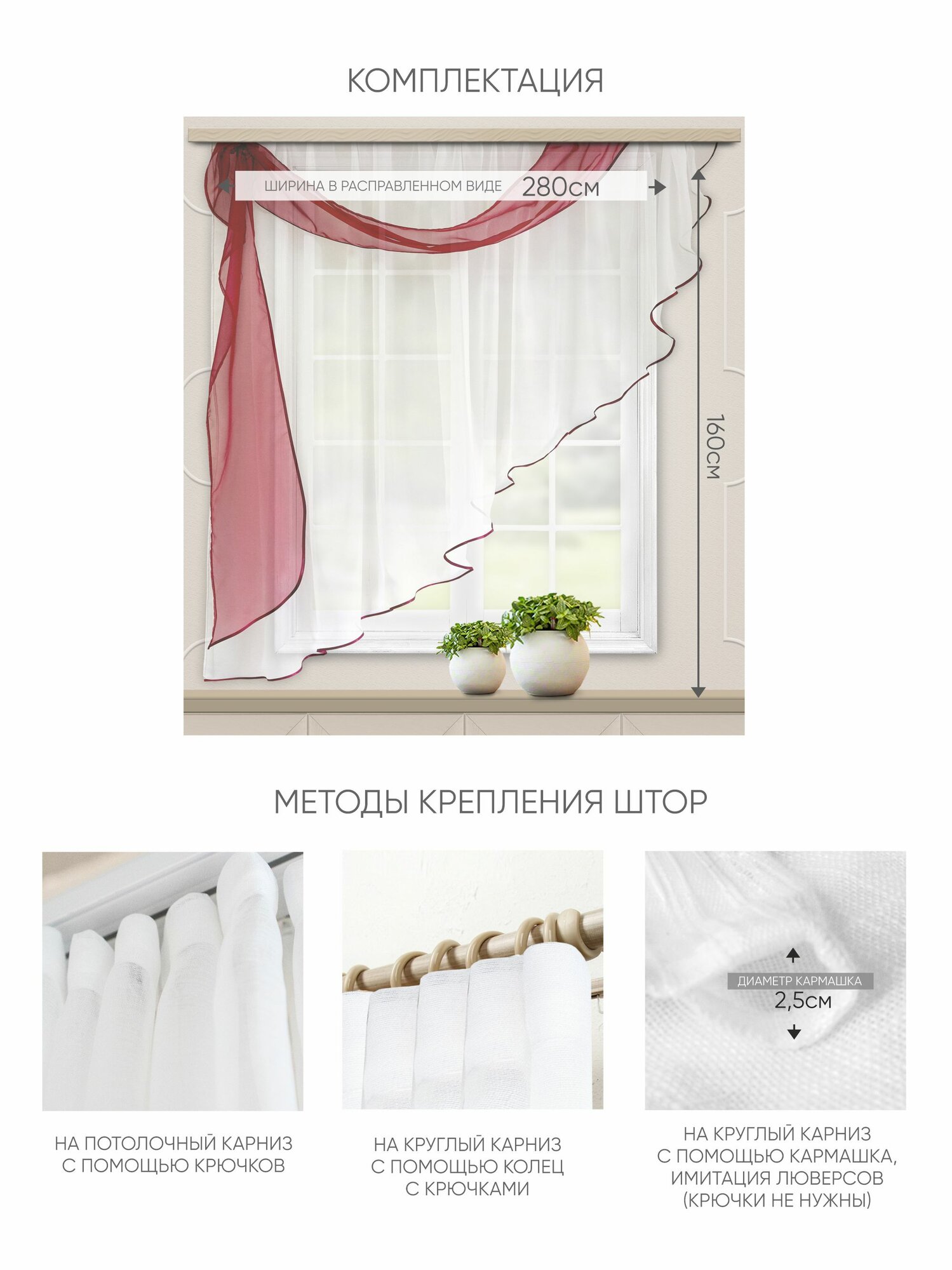| Отзыв: | Качественная штора. Цвет ленты все же красный, красным же подшито и основное. Есть лента укрепляющая для цеплялок. Повесила сразу и глаз радуется. Она довольно длинная. |