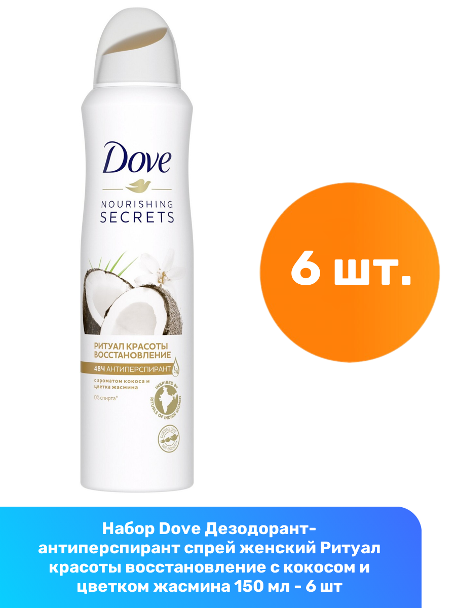 Dove Дезодорант-антиперспирант спрей женский Ритуал красоты восстановление с кокосом и цветком жасмина 150 мл - 6 шт