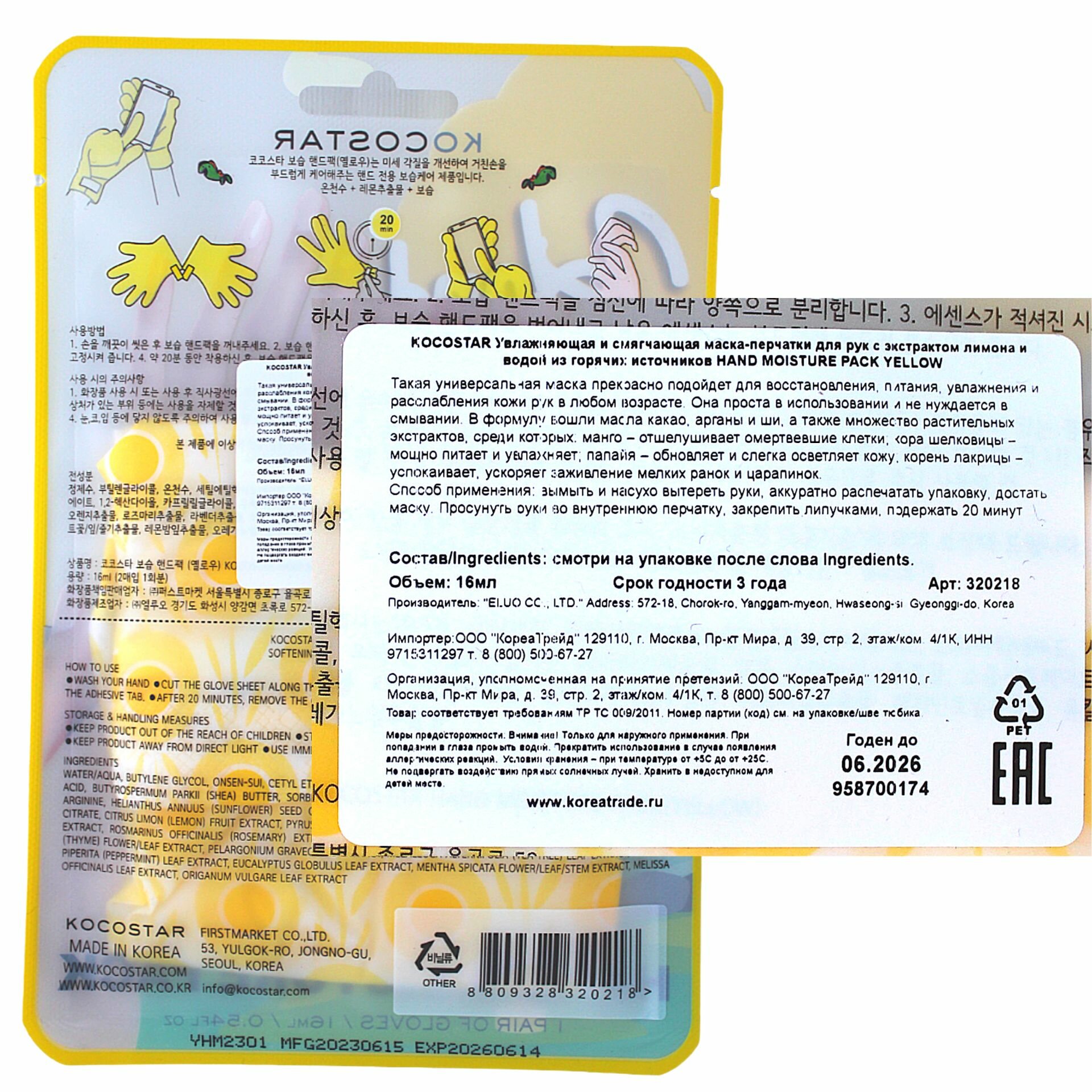 KOCOSTAR HAND MOISTURE PACK YELLOW Увлажняющая и смягчающая маска-перчатки для рук с экстрактом лимона и водой из горячих источников