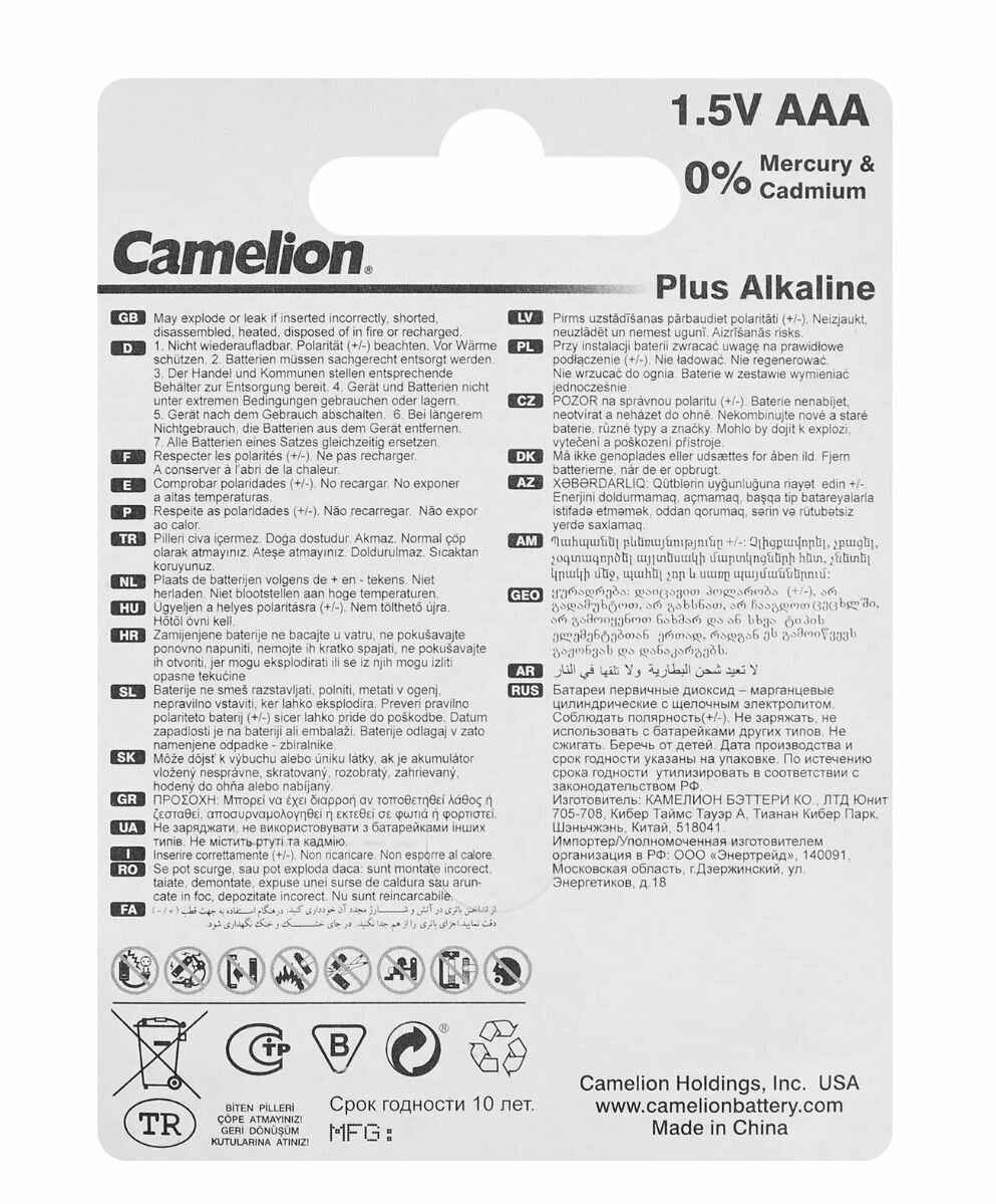 Camelion Plus Alkaline BL10 LR03 (LR03-BP10, батарейка,1.5В)(10шт. в уп-ке)