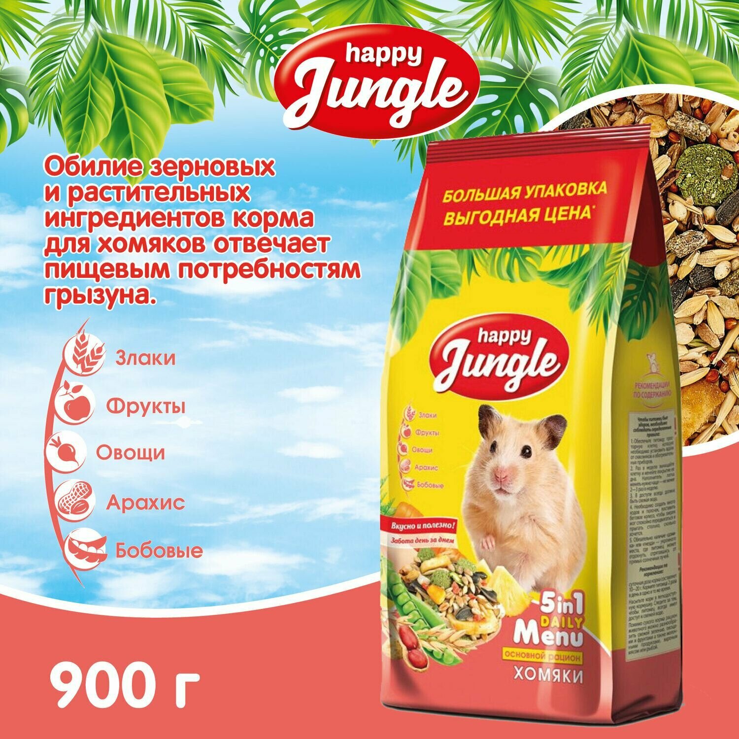 HAPPY JUNGLE Сухой корм для хомяков, 900 гр