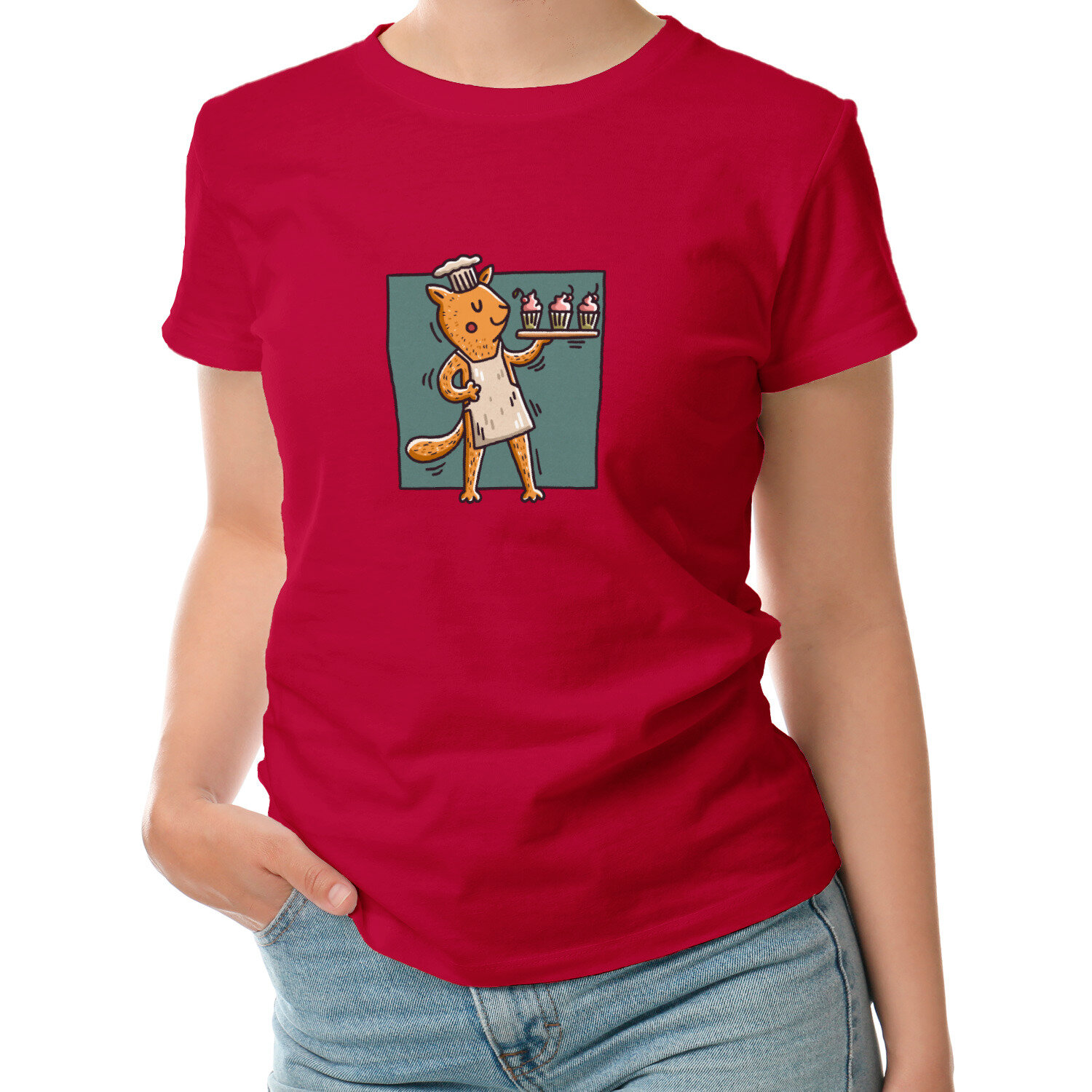 Женская футболка «Кот и кексы. Подарок повару, кондитеру. Капкейк» (S, красный)