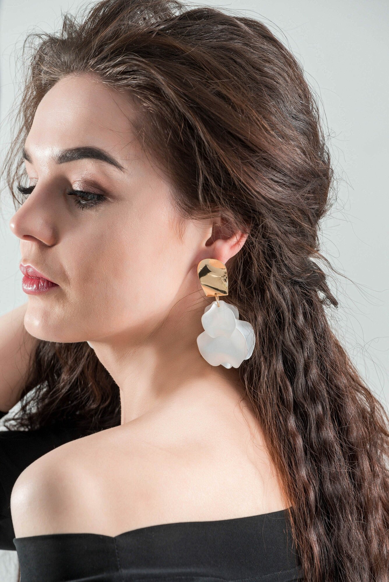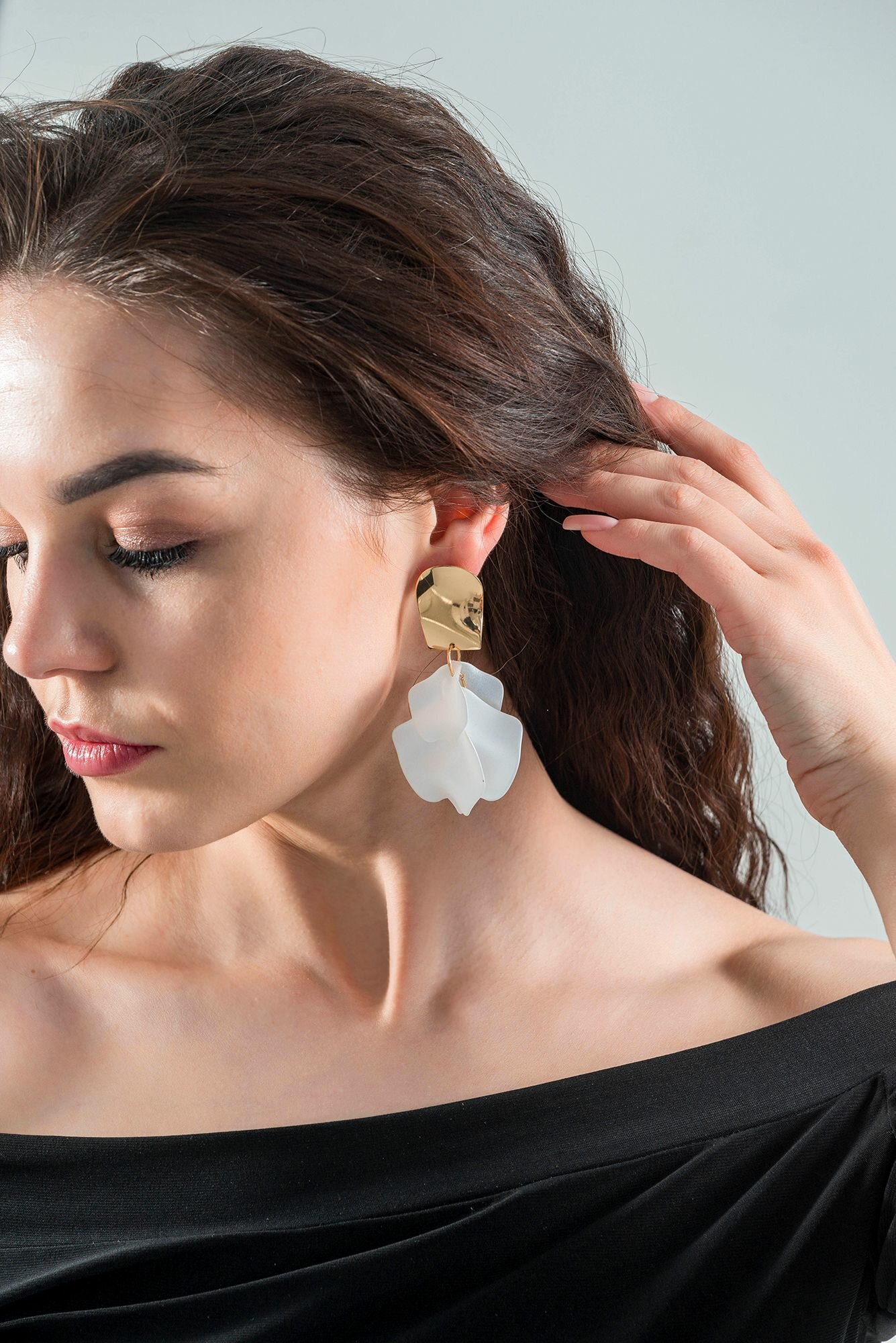Белые серьги лепестки висячие вечерние женские стильные сережки тренд 2024 интересное: