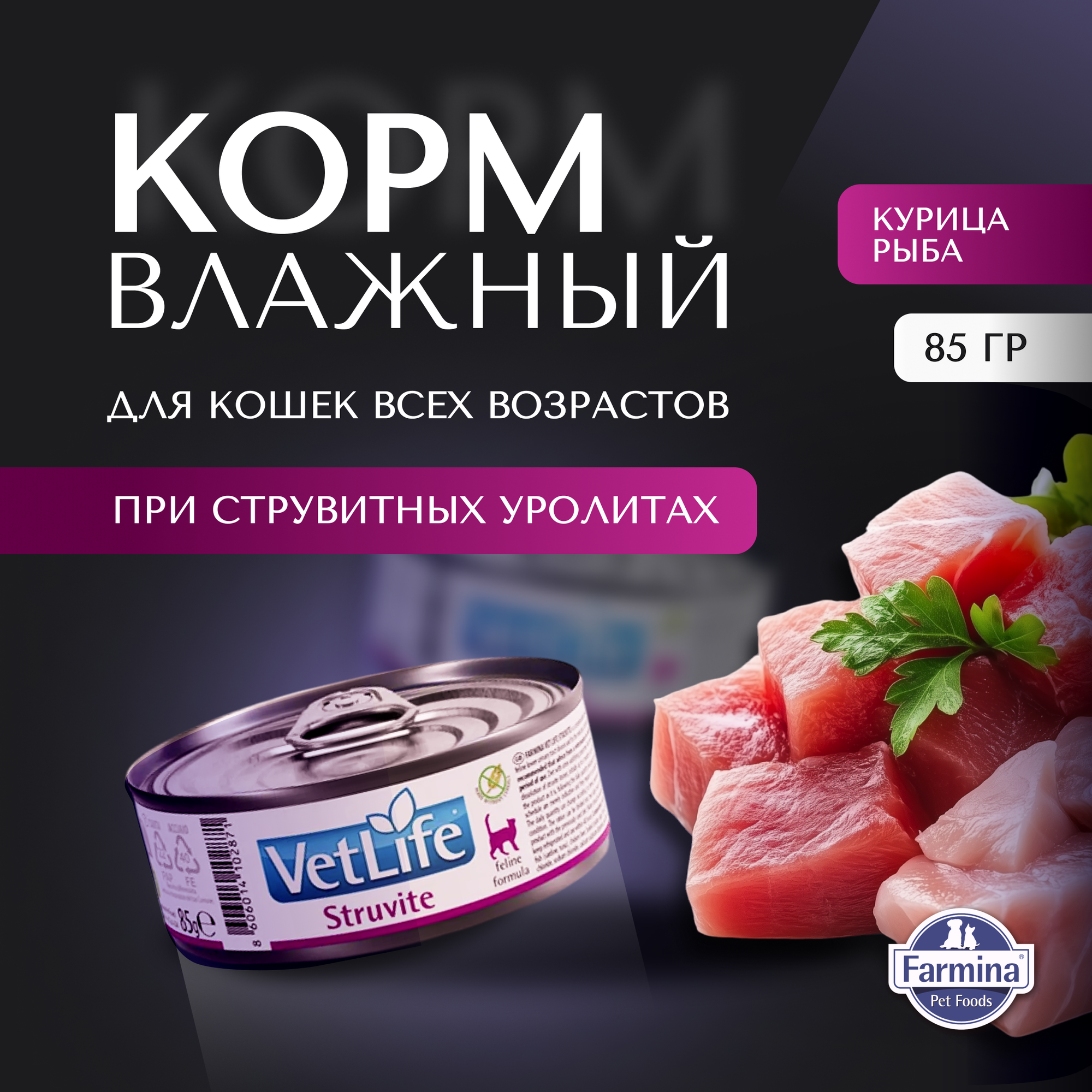 Влажный корм Farmina Vet Life Struvit для кошек всех пород, для растворения струвитных камней, Фармина Вет Лайф лечебный рацион со вкусом курицы и индейки, 12шт по 85г