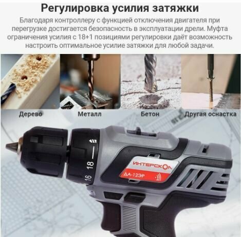 Дрель-шуруповерт аккумуляторная ИНТЕРСКОЛ ДА-18ЭР промо (18В, 2акк*2Ач Li-ion, 35Нм, 2скорости, подсветка, 1,1кг, экокейс)