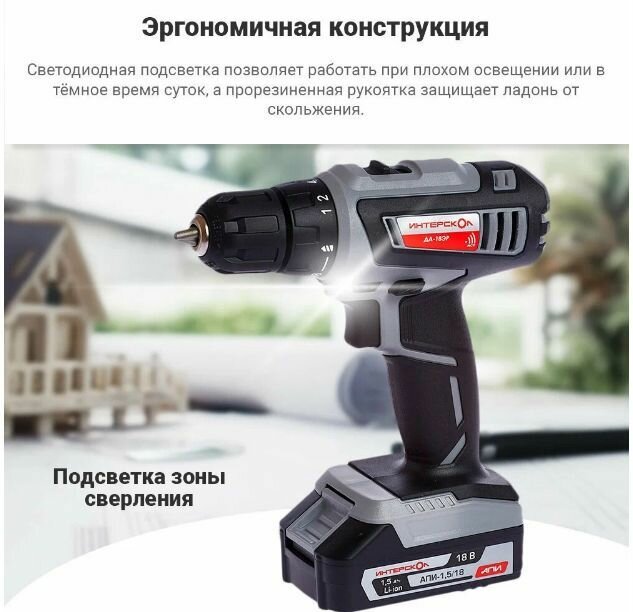 Купить Дрель-шуруповерт аккумуляторная ИНТЕРСКОЛ ДА-18ЭР промо (18В, 2акк*2Ач Li-ion, 35Нм, 2скорости, подсветка, 1,1кг, экокейс)