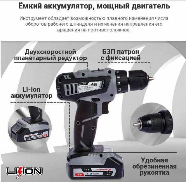 СохранитьДрель-шуруповерт аккумуляторная ИНТЕРСКОЛ ДА-18ЭР промо (18В, 2акк*2Ач Li-ion, 35Нм, 2скорости, подсветка, 1,1кг, экокейс) интересное: