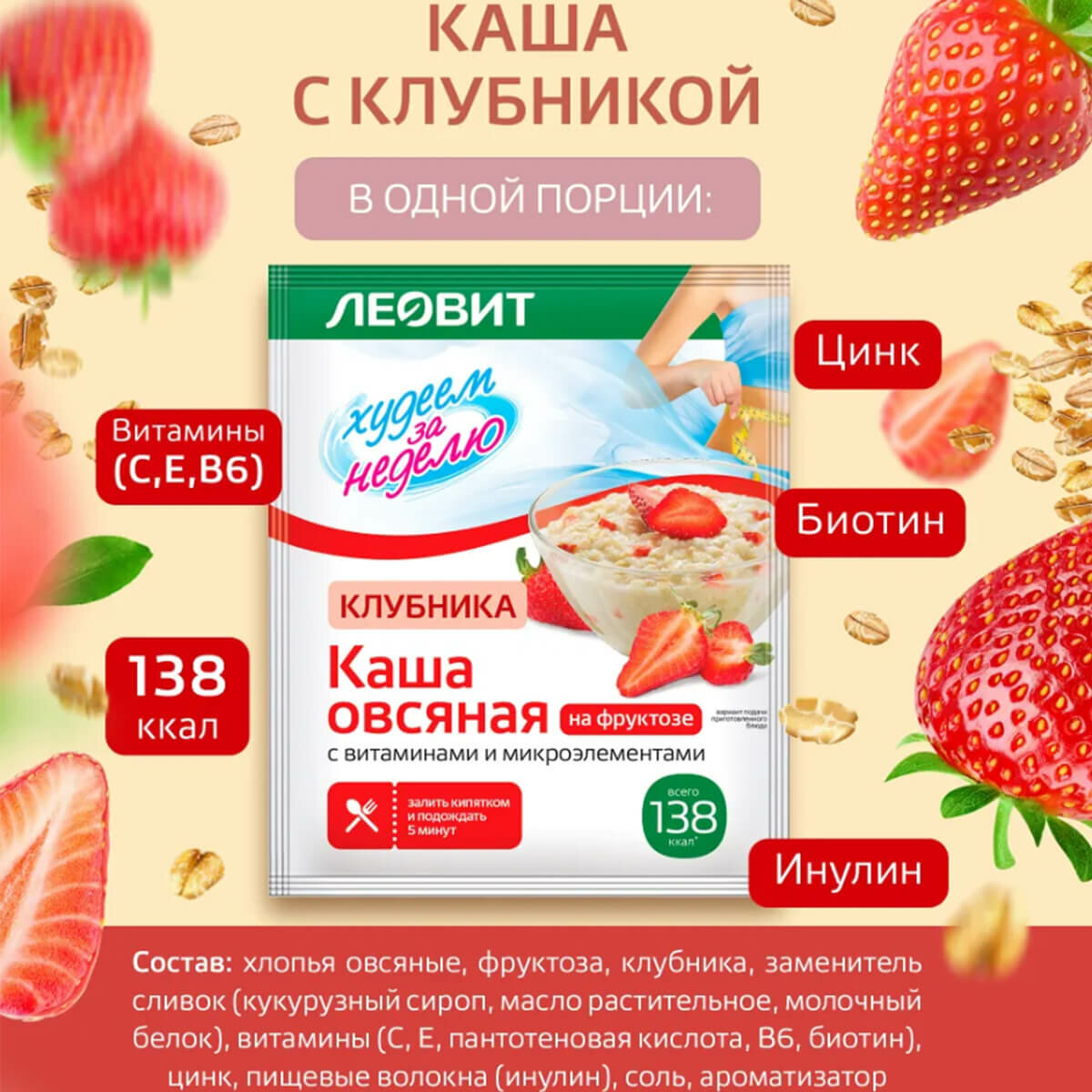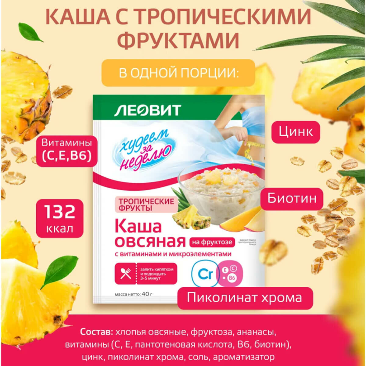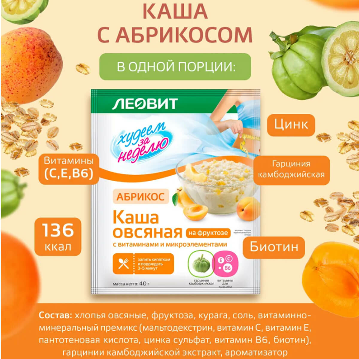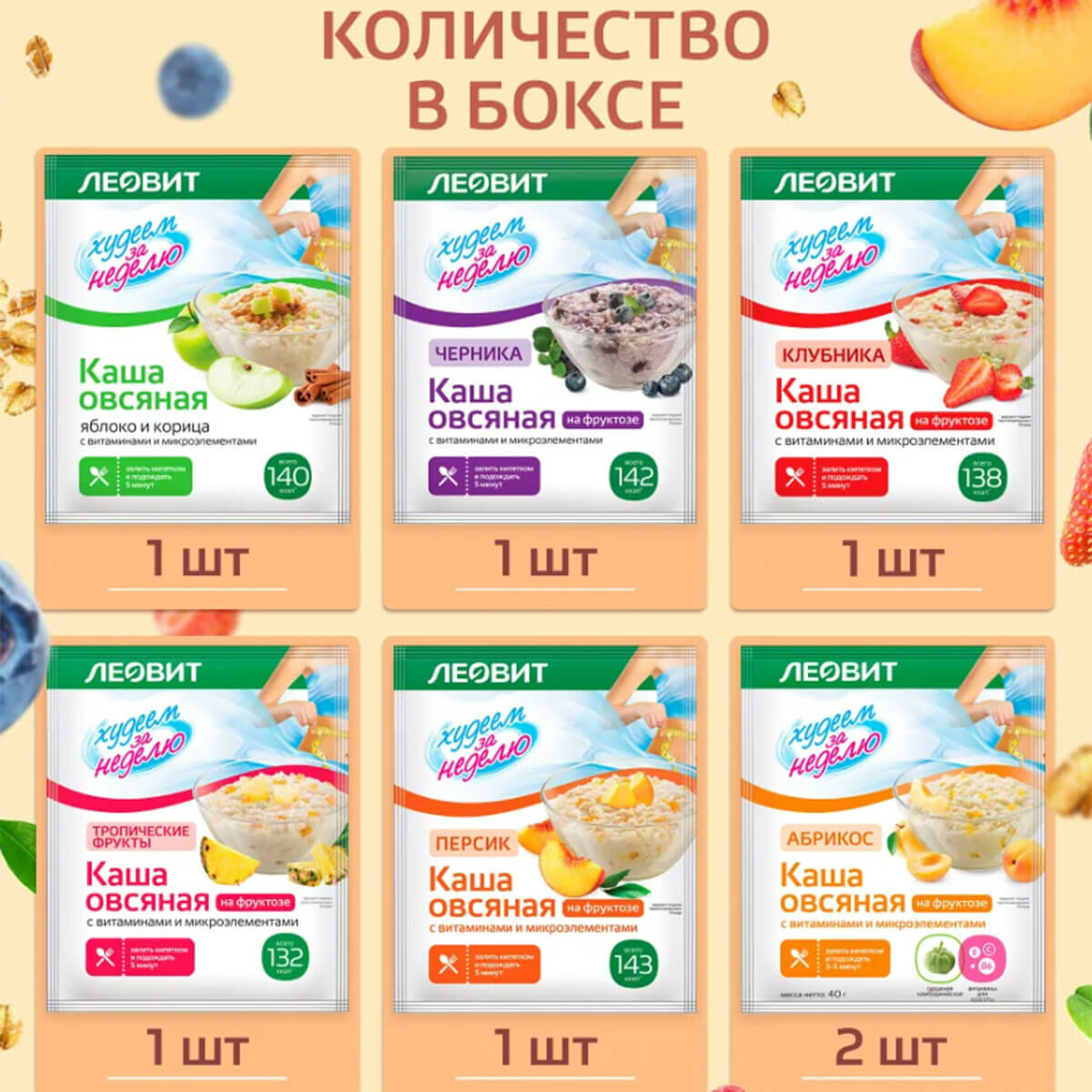 Леовит Каша овсяная Ассорти Худеем за неделю, 7 пакетов по 40 г, леовит