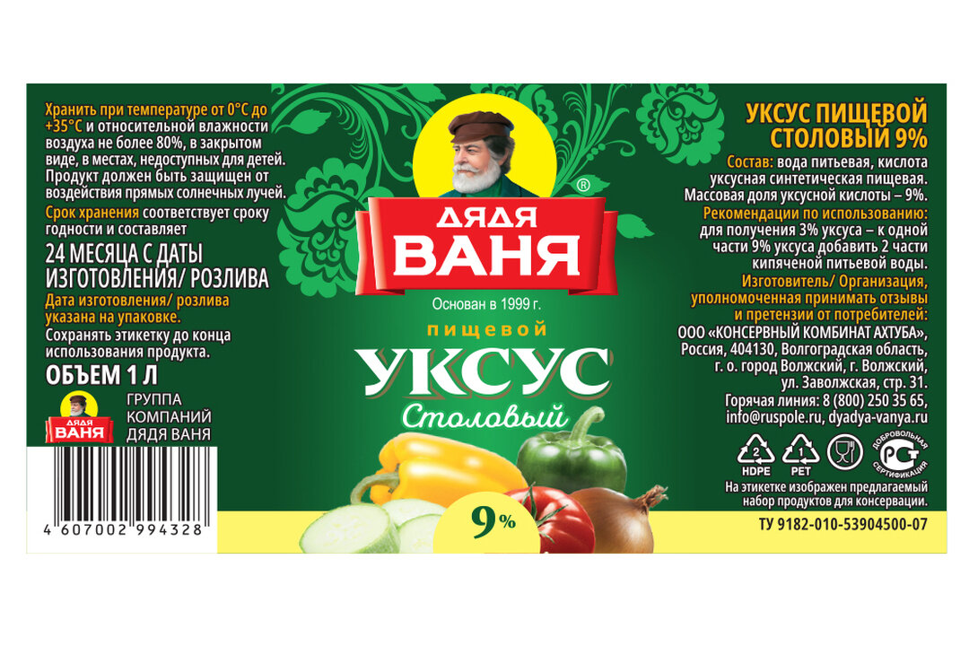 Ниже Вы можете прочитать отзывы на Уксус Дядя Ваня Столовый пищевой 1 л, ознакомится с подробными характеристиками, посмотреть интересные обзоры и фотографии на Уксус Дядя Ваня Столовый пищевой 1 л.