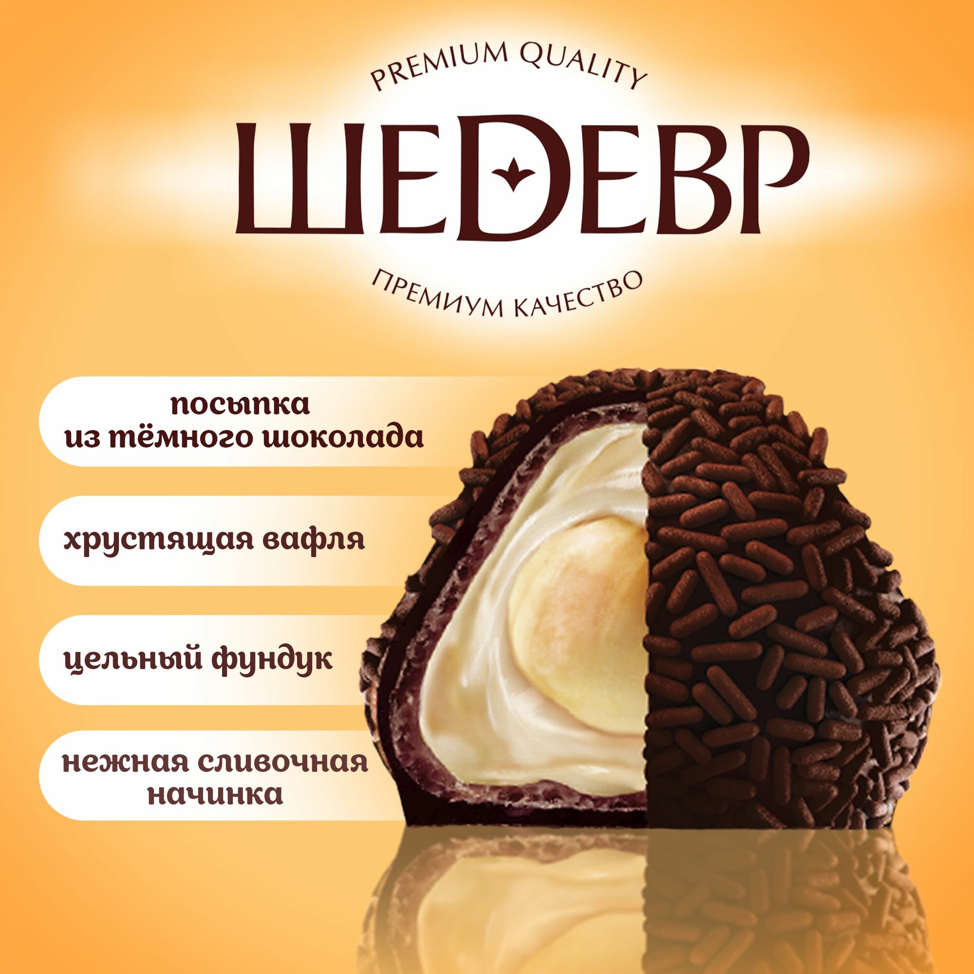 Купить Конфеты вафельные Шедевр, хрустящие со сливочной начинкой, целым фундуком и темным шоколадом, коробка 145 гр.