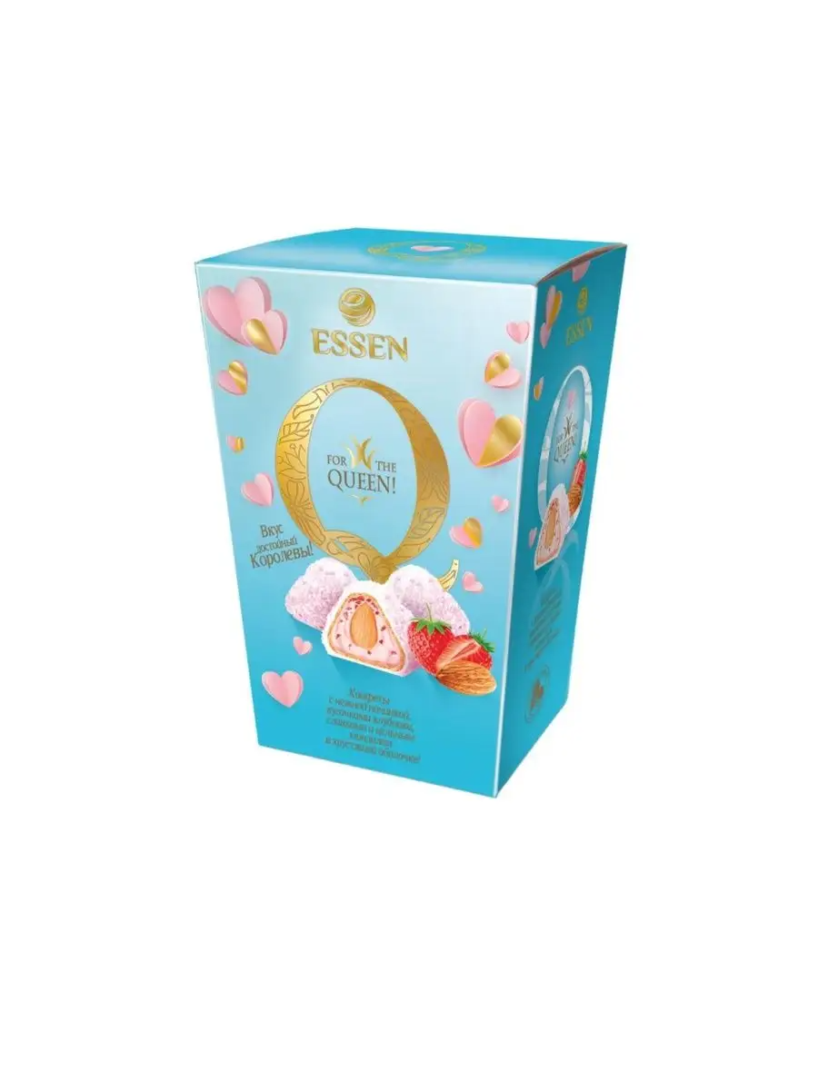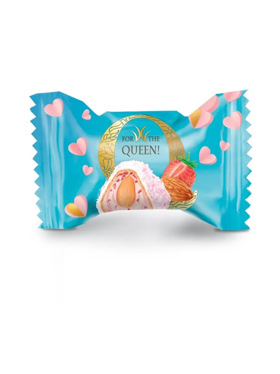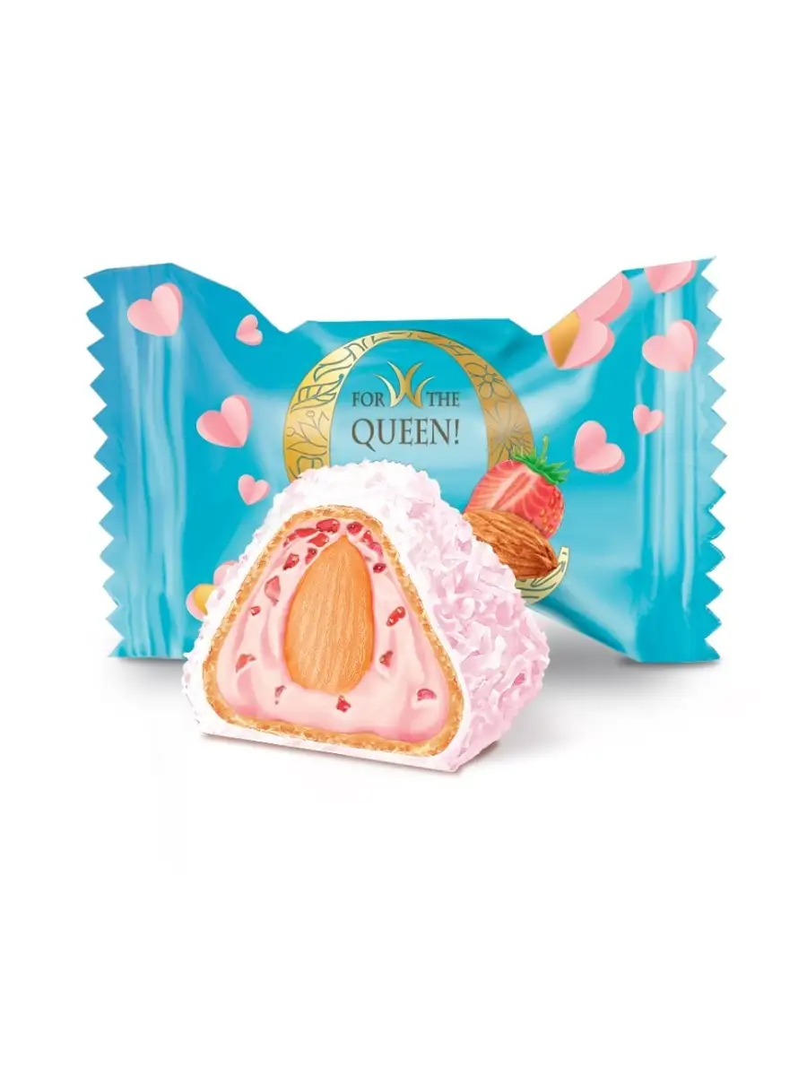 Купить Конфеты вафельные Q, со вкусом клубники со сливками, с миндалем и кокосом, коробка 150 г.
