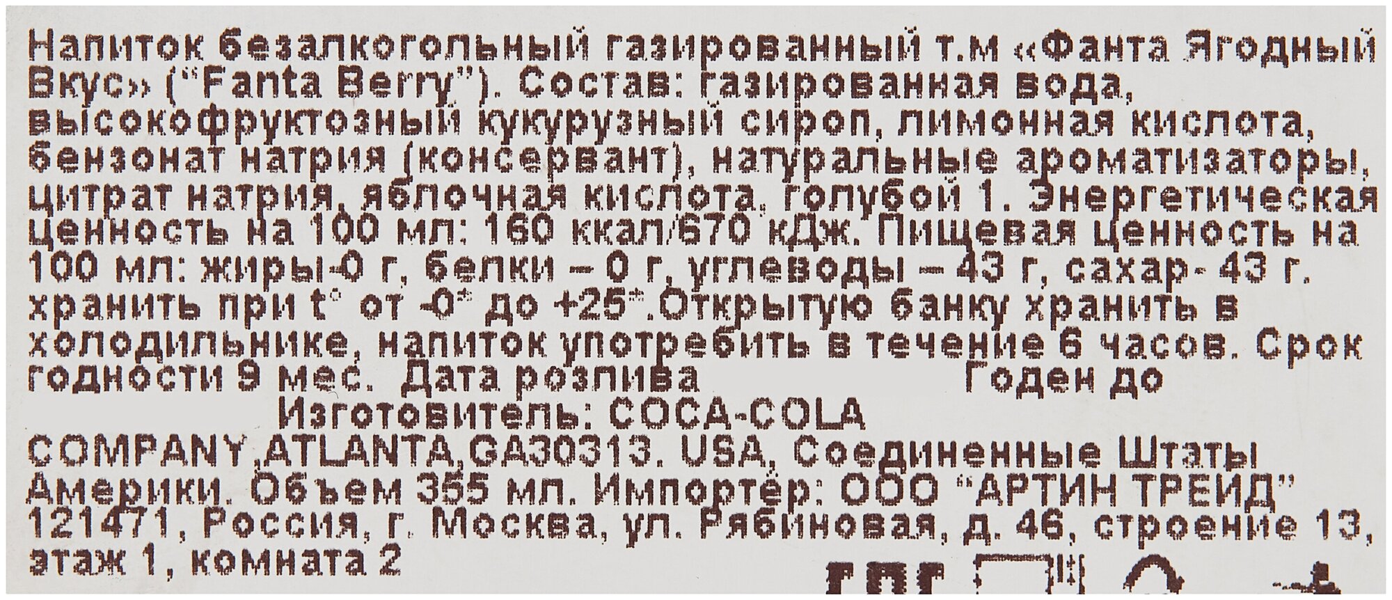 Газированный напиток Fanta Berry, США, 0.355 л, металлическая банка, 12 шт.