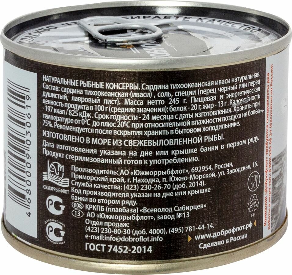 Сардина доброфлот тихоокеанская "" (иваси) натуральная 245 г
