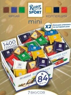 Купить Набор мини-шоколада Ritter Sport "Яркая Коллекция": 7 вкусов, 1400 г, 84 штуки