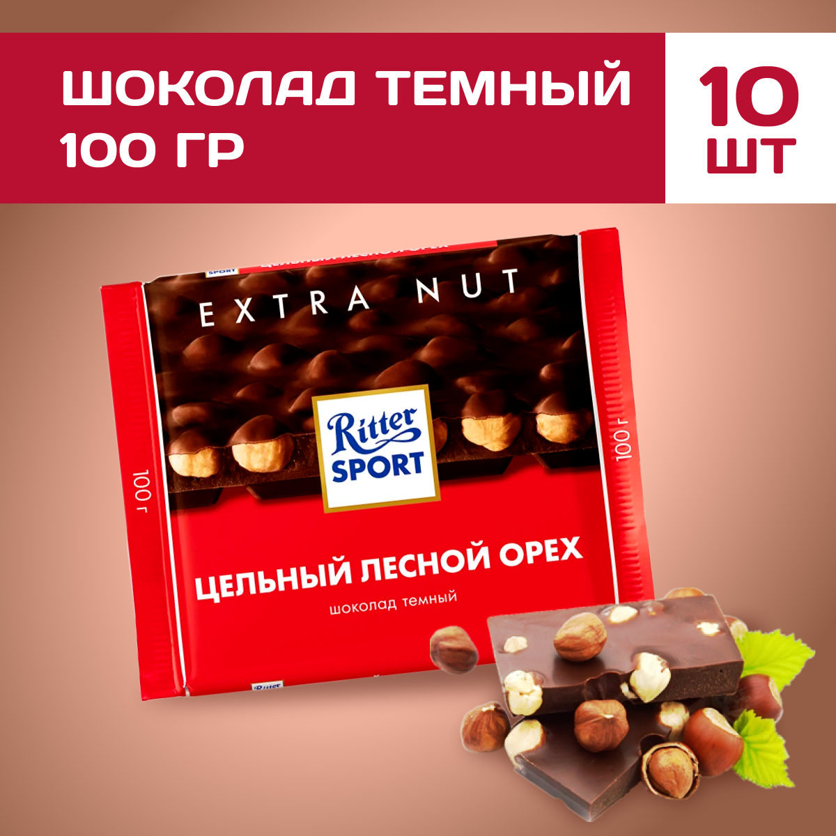 Шоколад Ritter Sport Extra Nut темный цельный лесной орех, 100 г, 10 уп.