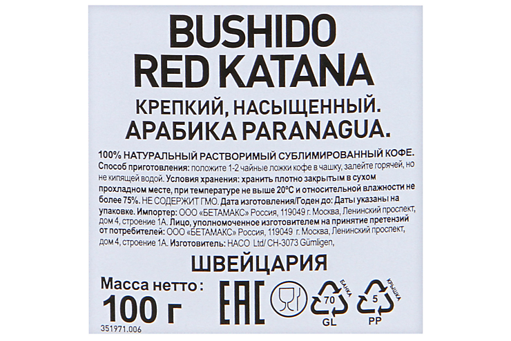 Кофе Bushido Red Katana растворимый, сублим., 100г