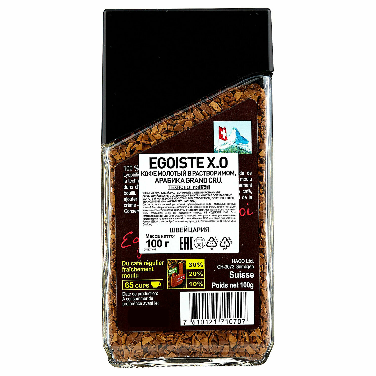Кофе молотый в растворимом EGOISTE "X.O", 100 г, стеклянная банка, сублимированный, швейцария, EG100