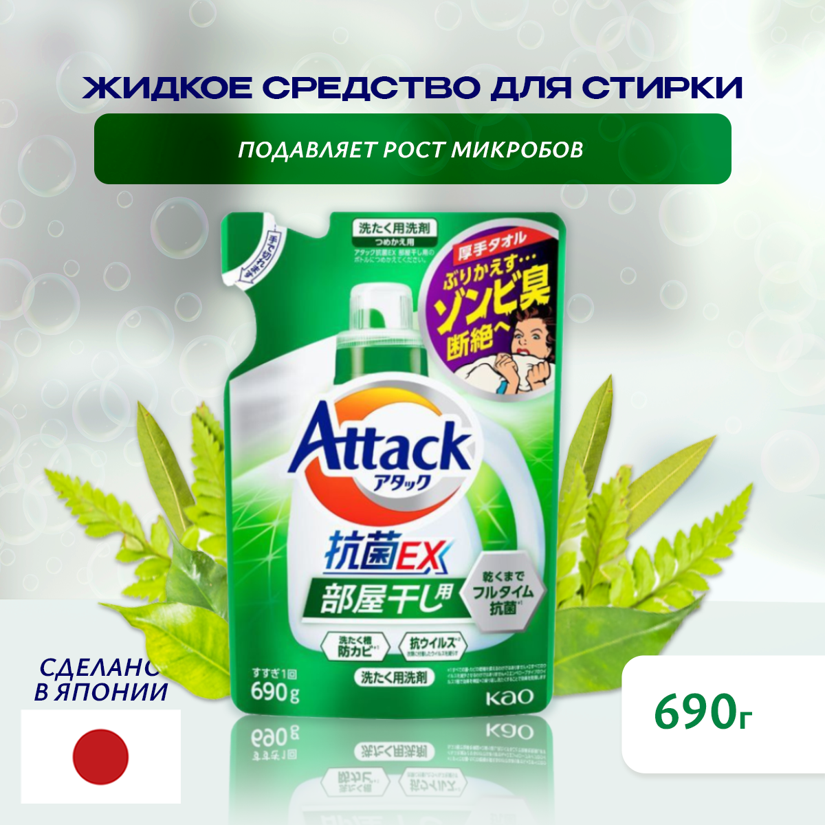 KAO Гель для стирки белья Attack EX Multi-Action ВСЕ В одном Высокоэффективный многофункциональный антибактериальный для сушки в помещении, аромат свежести, 690 гр. сменная упаковка