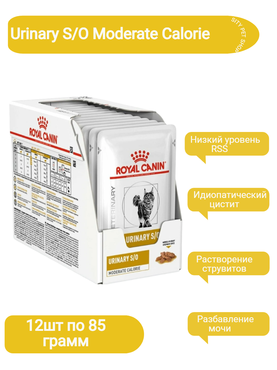 Ниже Вы можете прочитать отзывы на Влажный корм для кошек Royal Canin Urinary S/O Moderate Calorie, для лечения МКБ, 12 шт. х 85 г (кусочки в соусе), ознакомится с подробными характеристиками, посмотреть интересные обзоры и фотографии на Влажный корм для кошек Royal Canin Urinary S/O Moderate Calorie, для лечения МКБ, 12 шт. х 85 г (кусочки в соусе).