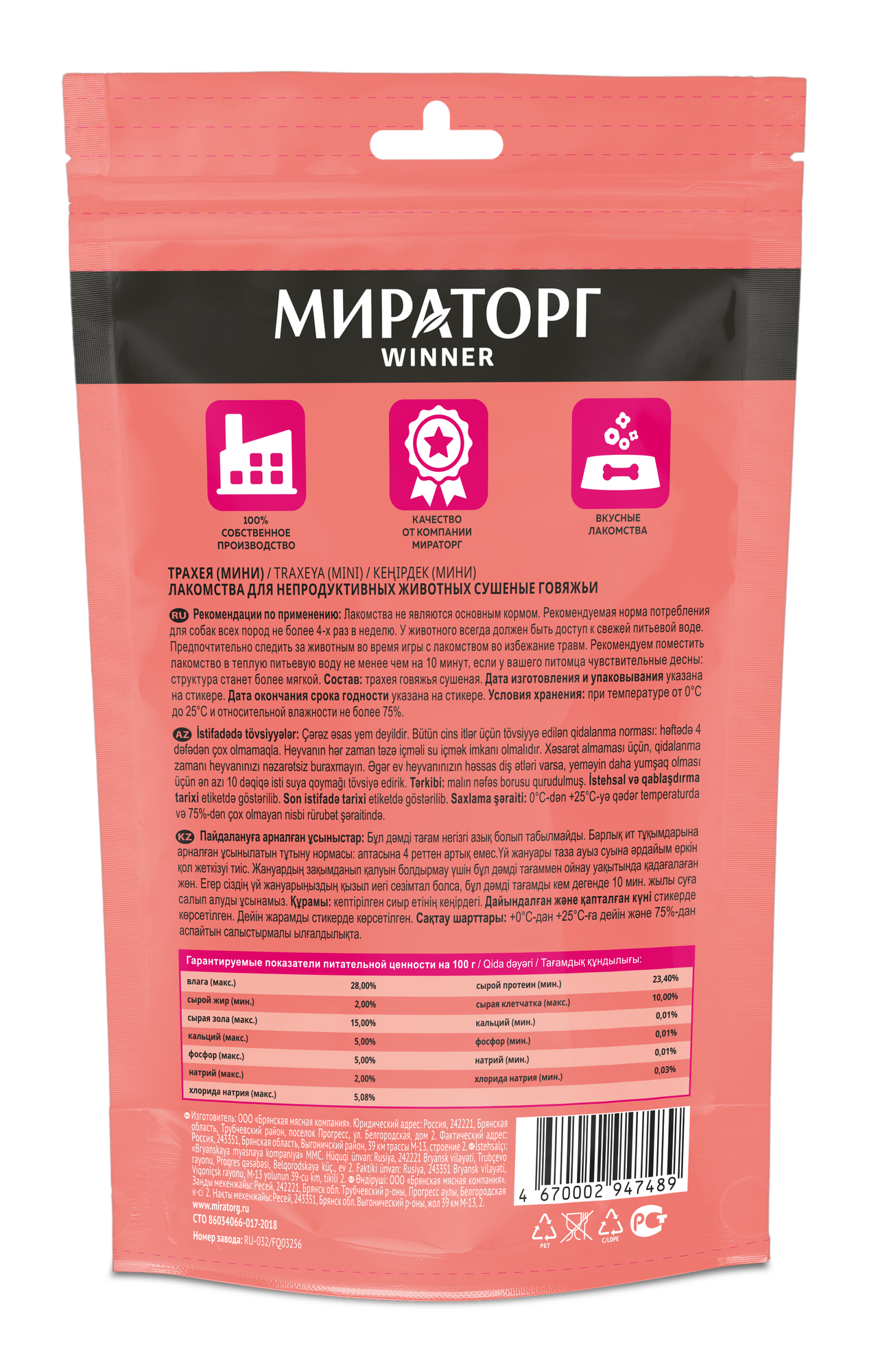 Winner Трахея говяжья для собак пакет, 50 гр