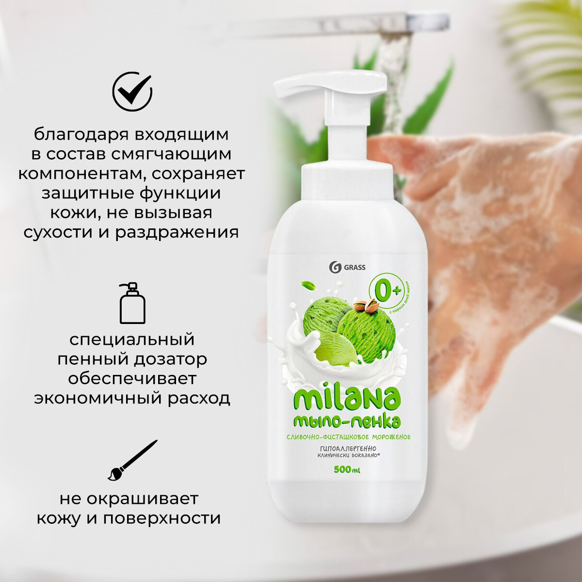 Мыло-пенка для рук Grass Milana Сливочно-фисташковое мороженое, 500 мл