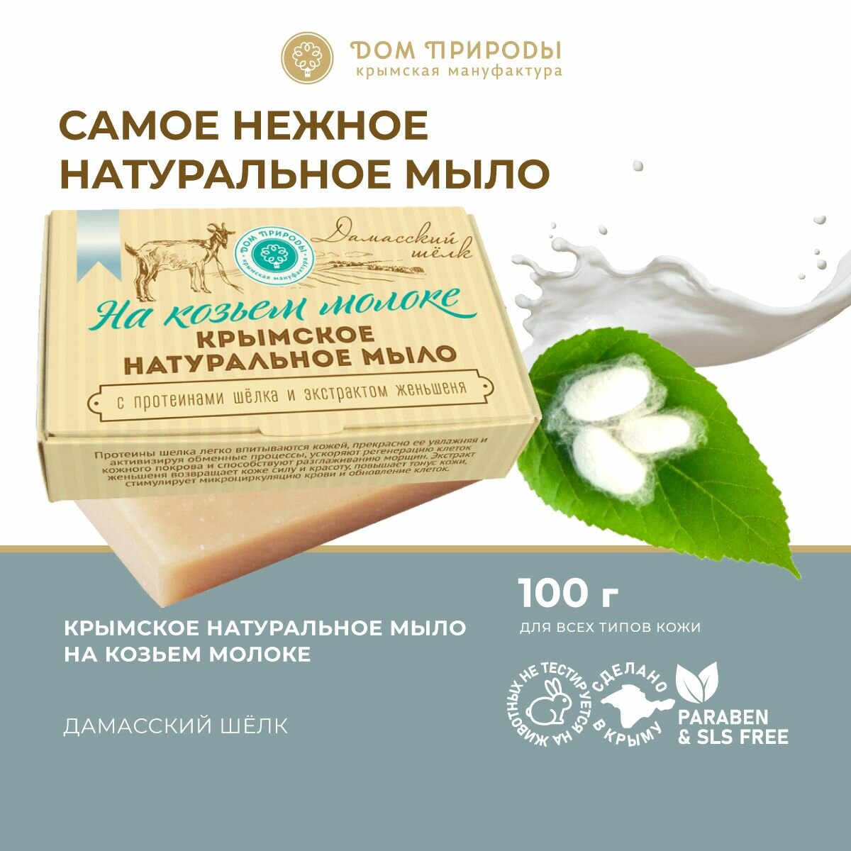 Мыло крымское на козьем молоке Дамасский шелк с протеинами шелка | Дом Природы (100г)