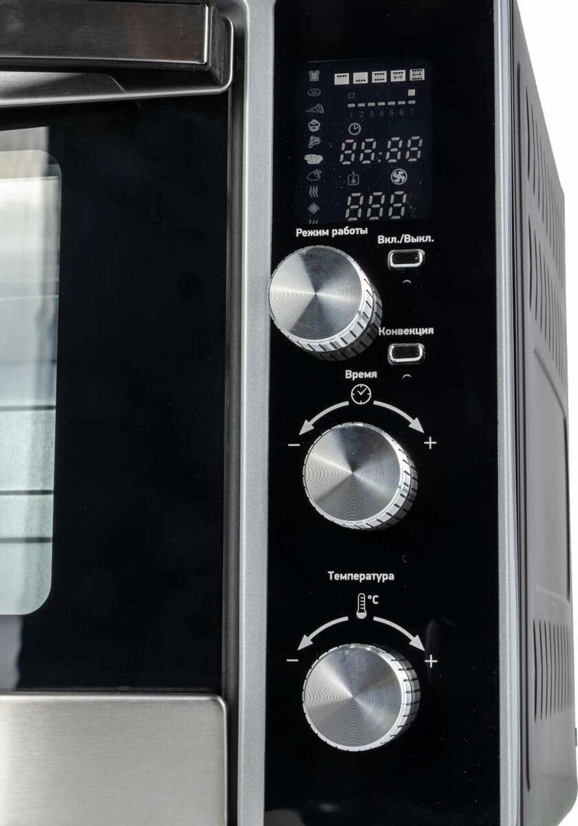 | Плюсы: | Переключение температуры от 30 до 230 гр., конвекция, шумит не сильно, держатель для противня и решетки. |