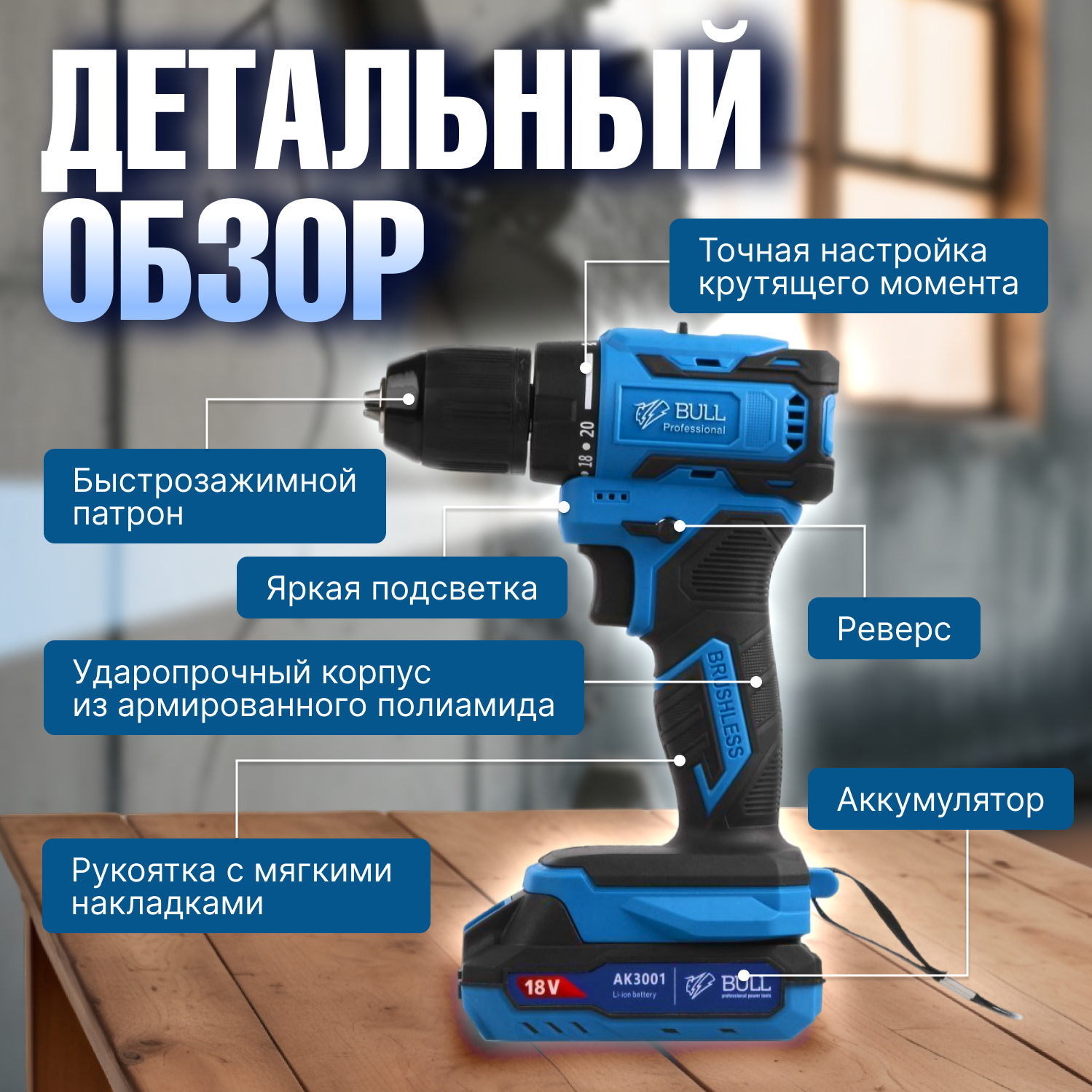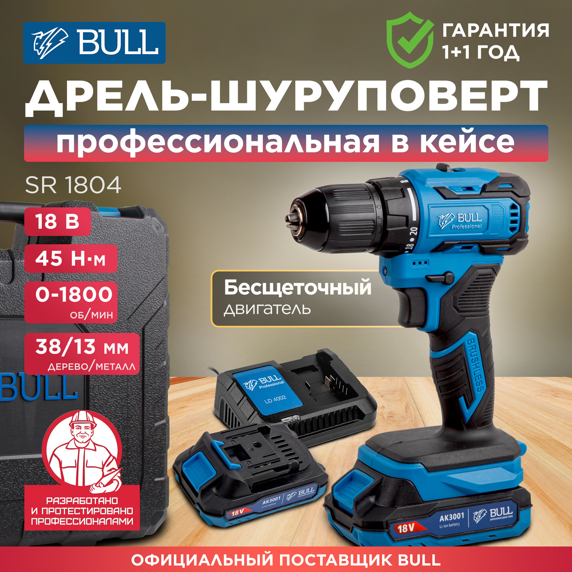 Купить BULL Аккум. дрель-шуруповерт SR 1804 в чем. Бесщет., Импульс., 18 В, 45 Н*м, 2x2 А*ч, з/у 4 А 1329421