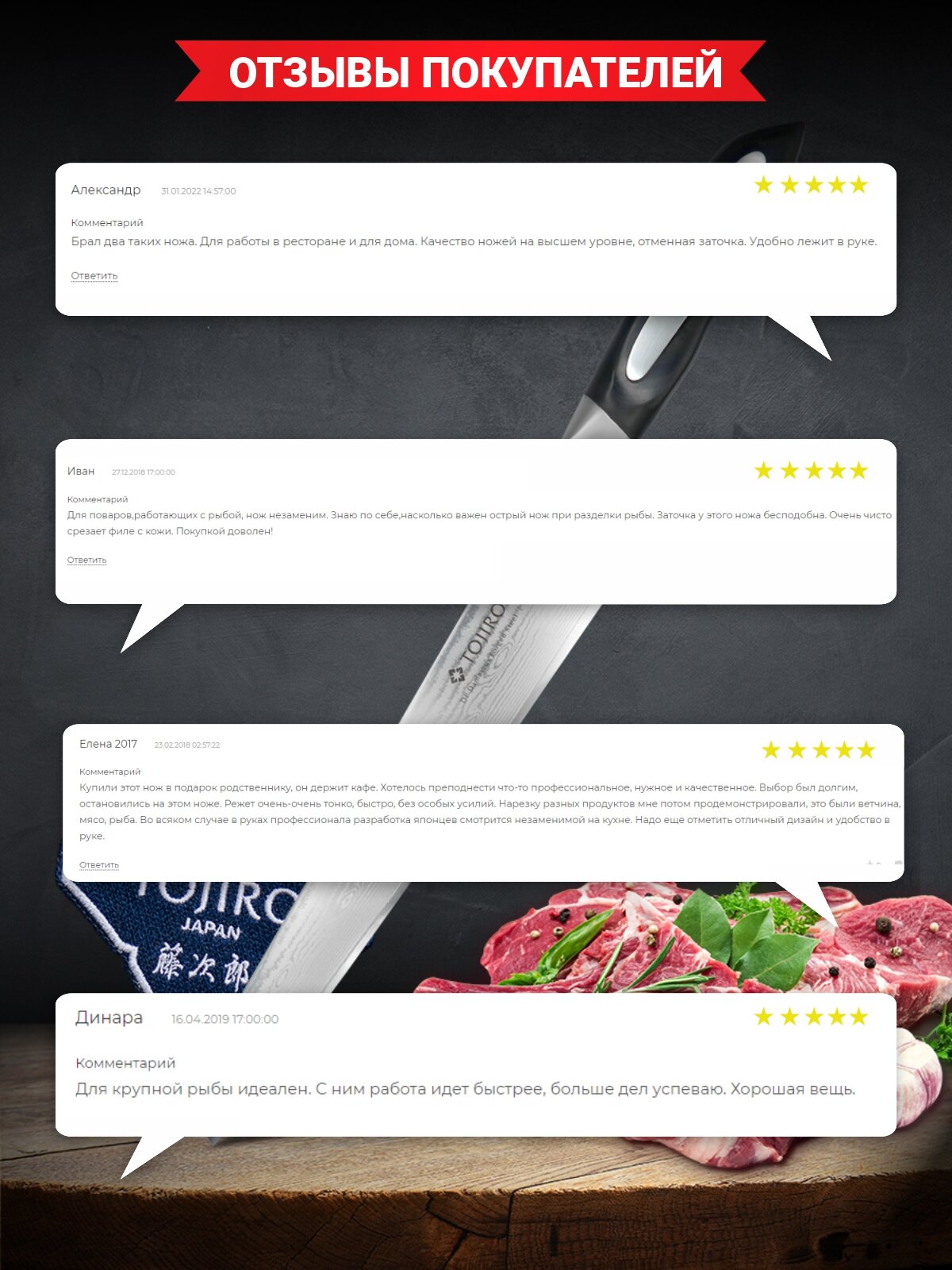 Ниже Вы можете прочитать отзывы на Кухонный нож для нарезки семги TOJIRO ff-sl240, ознакомится с подробными характеристиками, посмотреть интересные обзоры и фотографии на Кухонный нож для нарезки семги TOJIRO ff-sl240.
