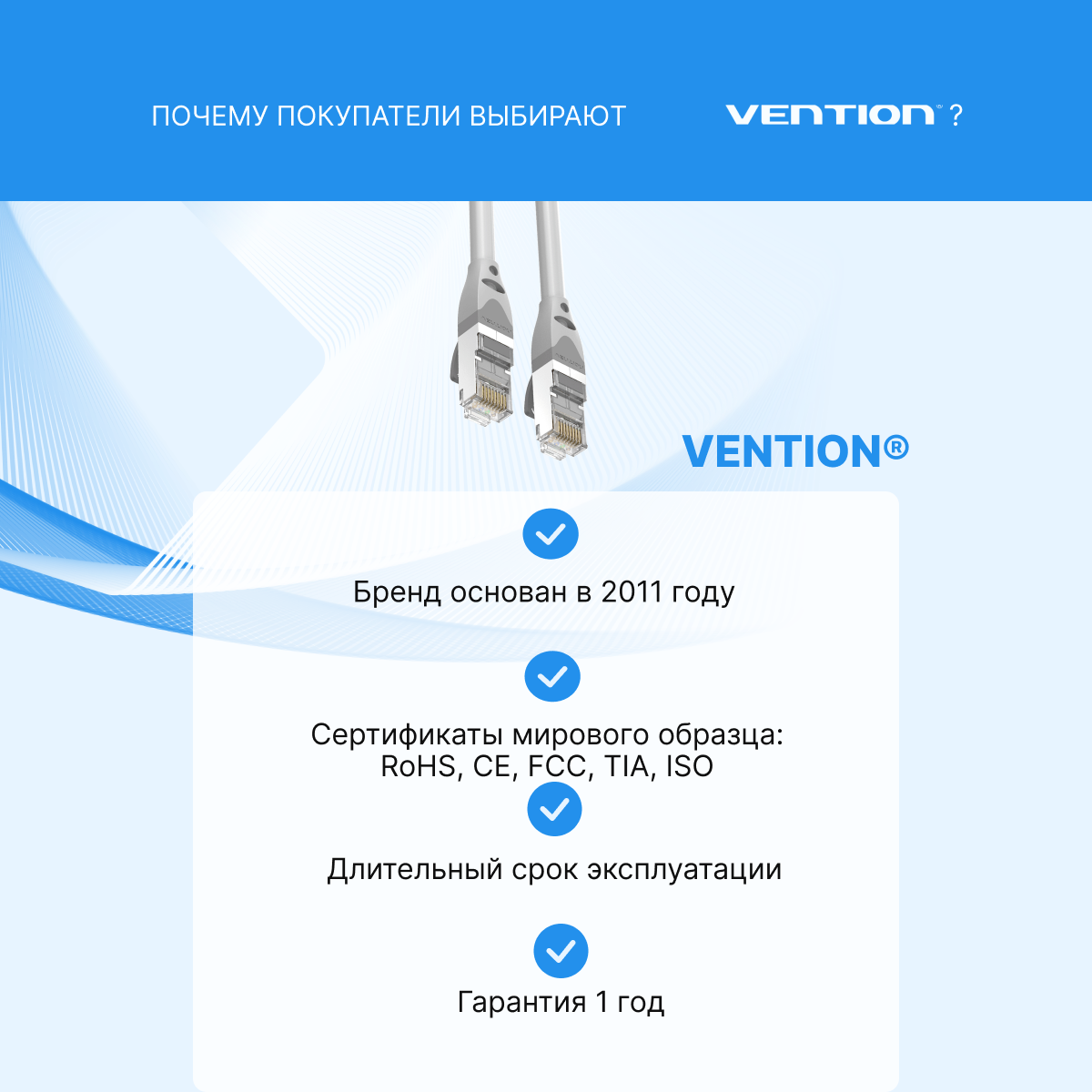 Vention Патч корд прямой SFTP cat.6A RJ45, кабель для интернета, провод, лан сетевой, шнур, 1.5 м, цвет серый