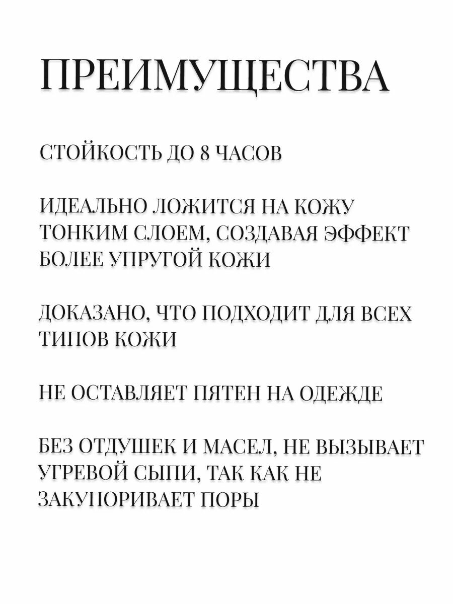 | Плюсы: | Легкий в нанесении почти незаметный с кожей очень ладят |