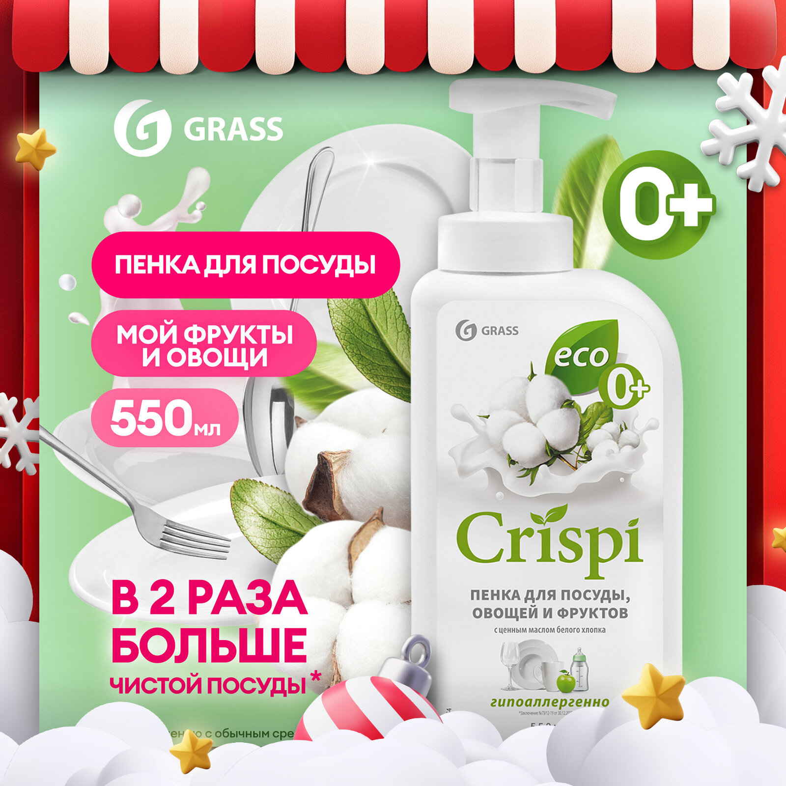 Средство-пенка для мытья посуды "CRISPI" (белый хлопок) 0,55 Л "GRASS"