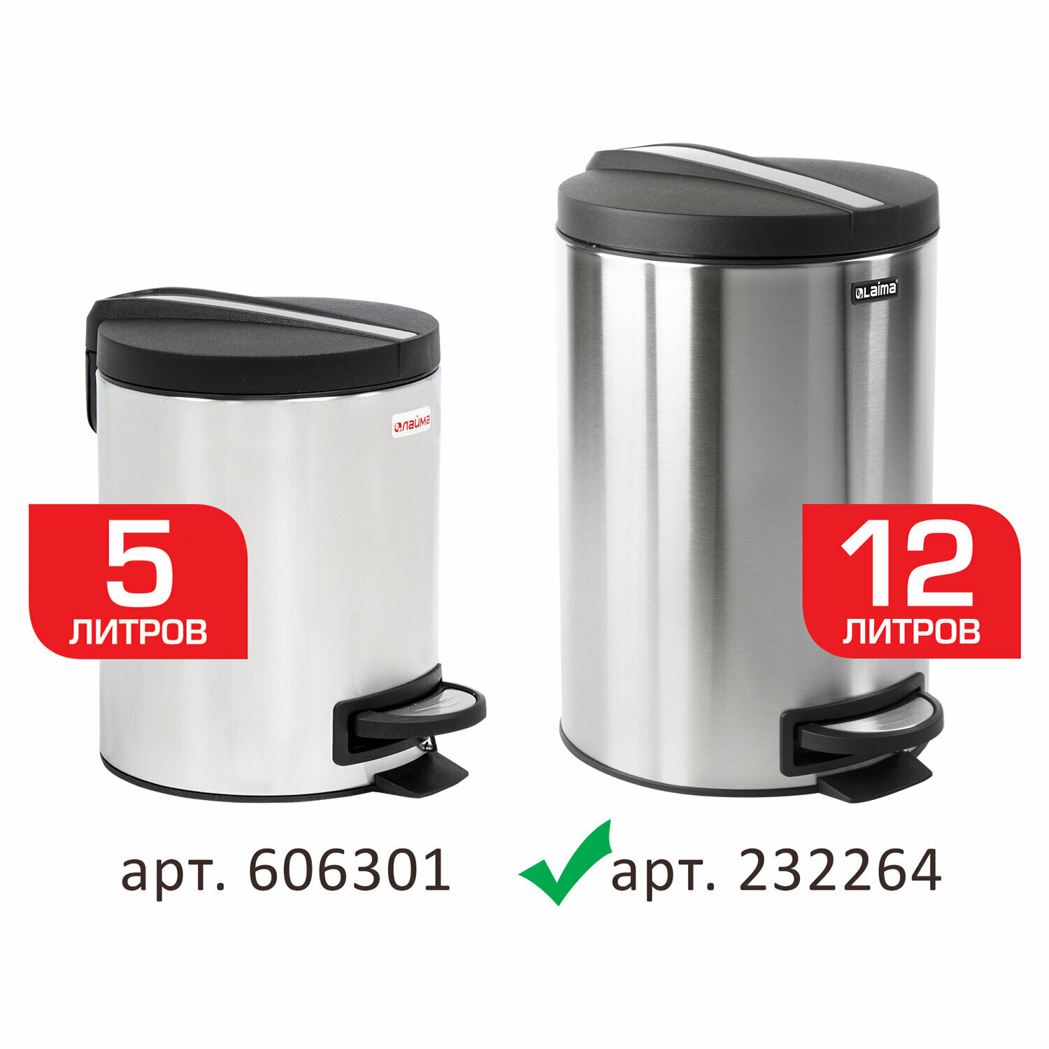 Ведро-контейнер для мусора (урна) с педалью LAIMA "Modern", комплект 5 шт., 12 л, матовое, нержавеющая сталь, со съемным внутренним ведром, 232264