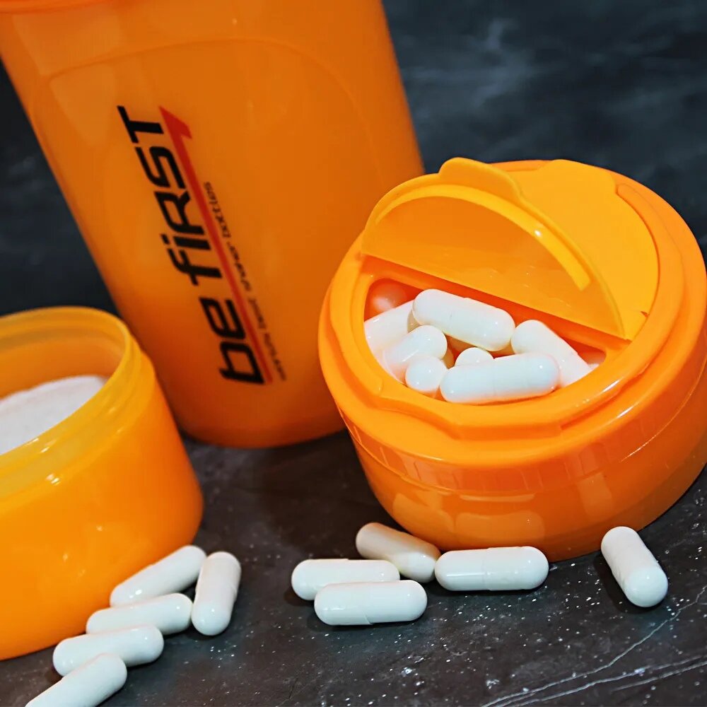 | Плюсы: | Удобный шейкер. 2 доп. отсека для протеина и таблеток. |