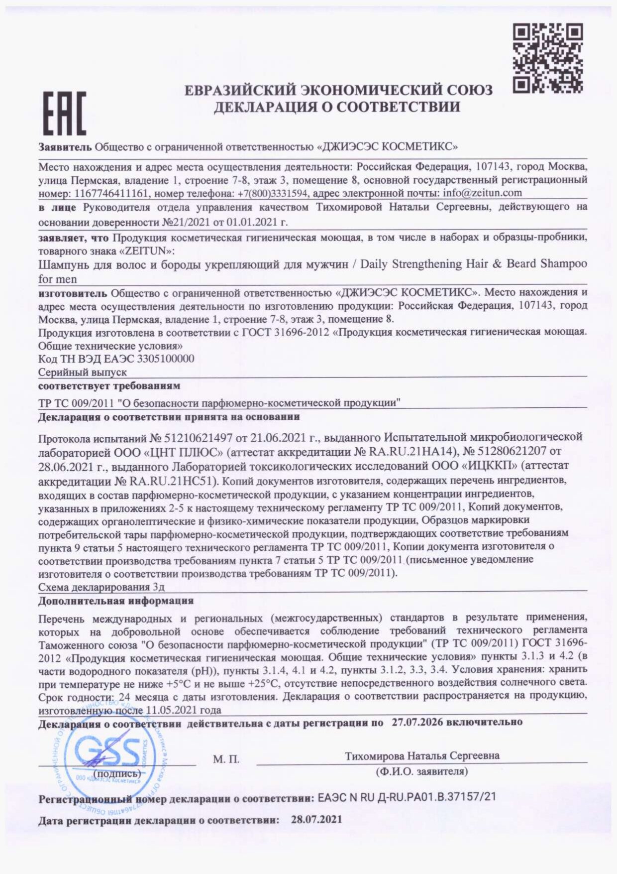 Шампунь для волос и бороды Zeitun Укрепляющий, 250 мл .