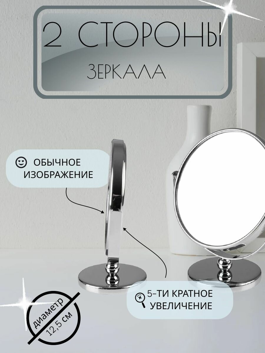 Зеркало косметическое 2-х стороннее увеличительное диаметр 12.5 см на ножке