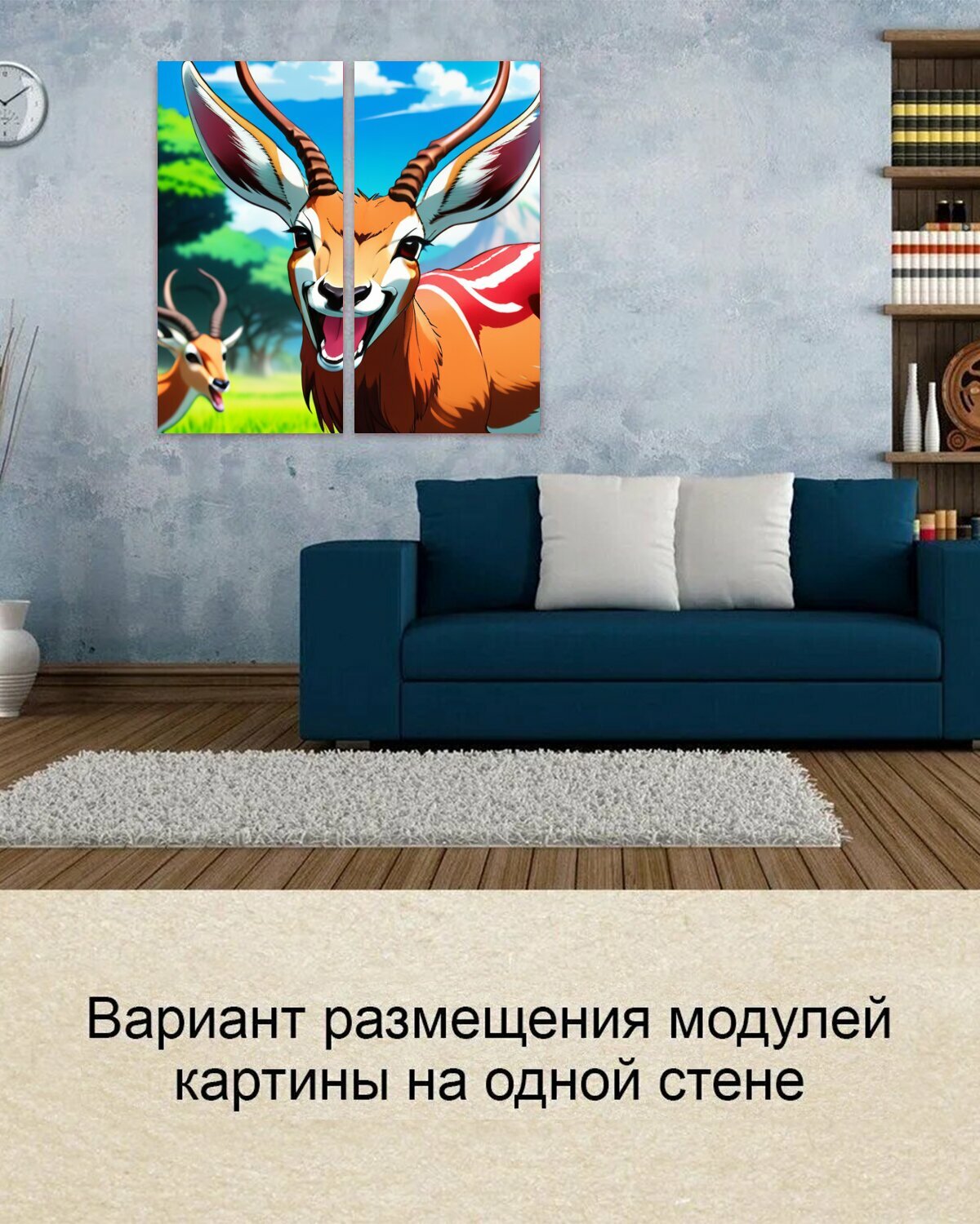 СохранитьМодульная картина на ОСП В детскую комнату "Животные, звери, антилопа смеется" 125x125 см. 2 части для интерьера на стену интересное: