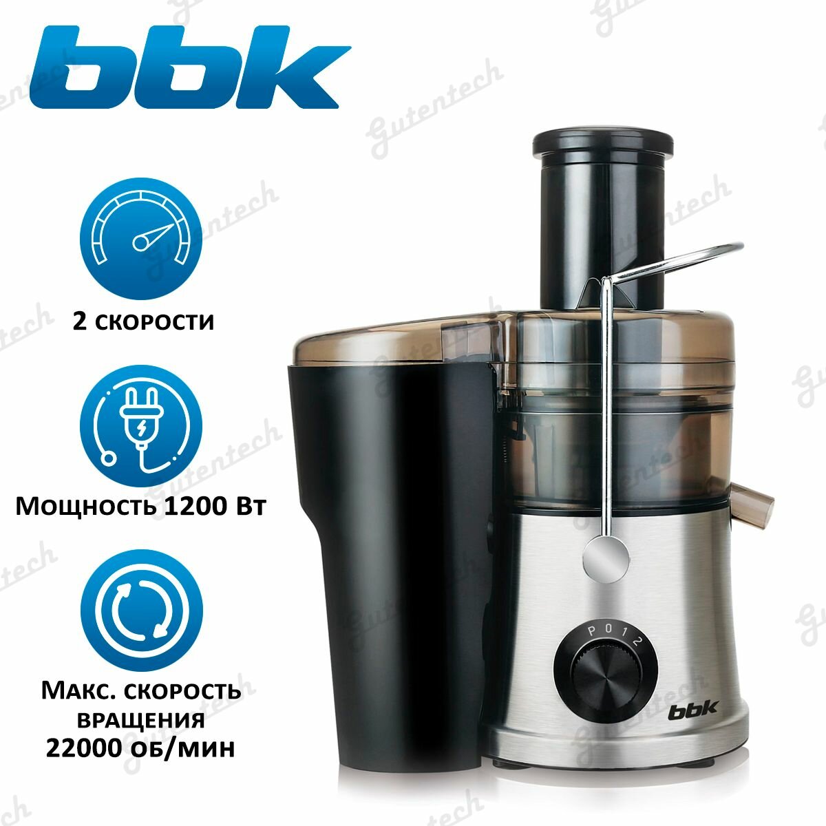Соковыжималка центробежная BBK JC100-H07 металлик/черный, мощность 1200 Вт, скорость вращения 22000 об/мин, 2 скорости, резервуар для мякоти 2,5 л