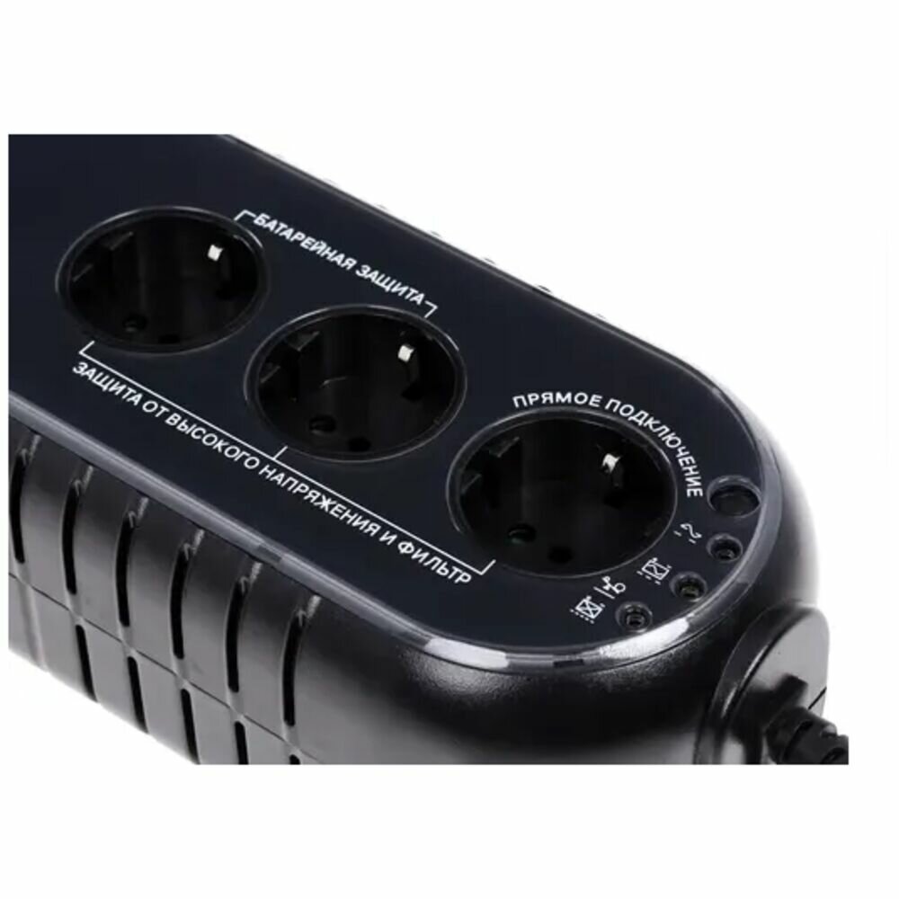 | Плюсы: | Все розетки имеют защиту от "втыкивания" в них сторонних предметов. Вилки же - входят достаточно плотно. Случайно не выдернешь. Кабель укреплён в месте соединения с корпусом. Корпус - ибп на пол два раза падал. С существенной высоты. И ничё, всё цело. Ни кусочка не откололось. |