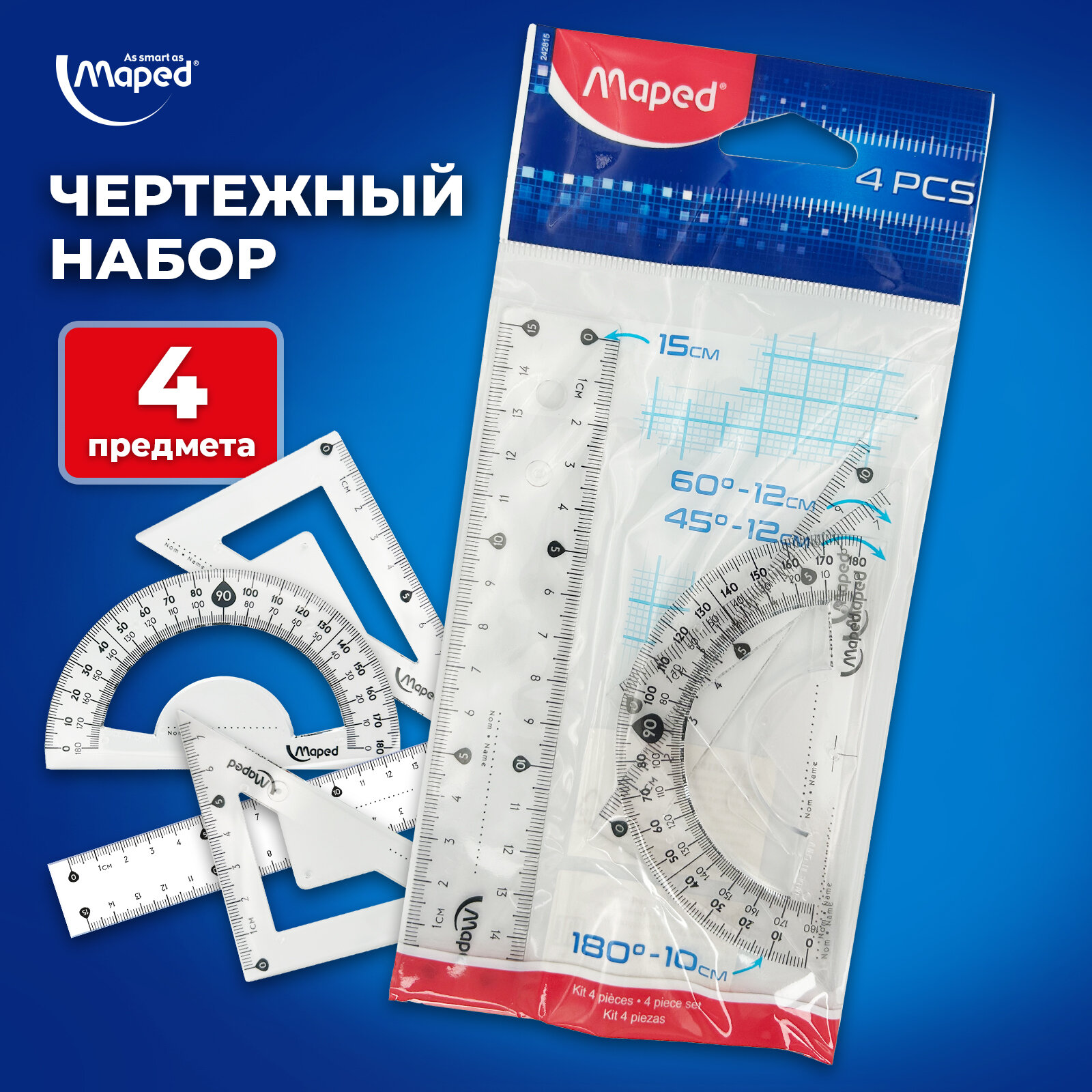 Набор чертежный малый MAPED "Start" (линейка 15 см, 2 угольника, транспортир), европодвес, 242815