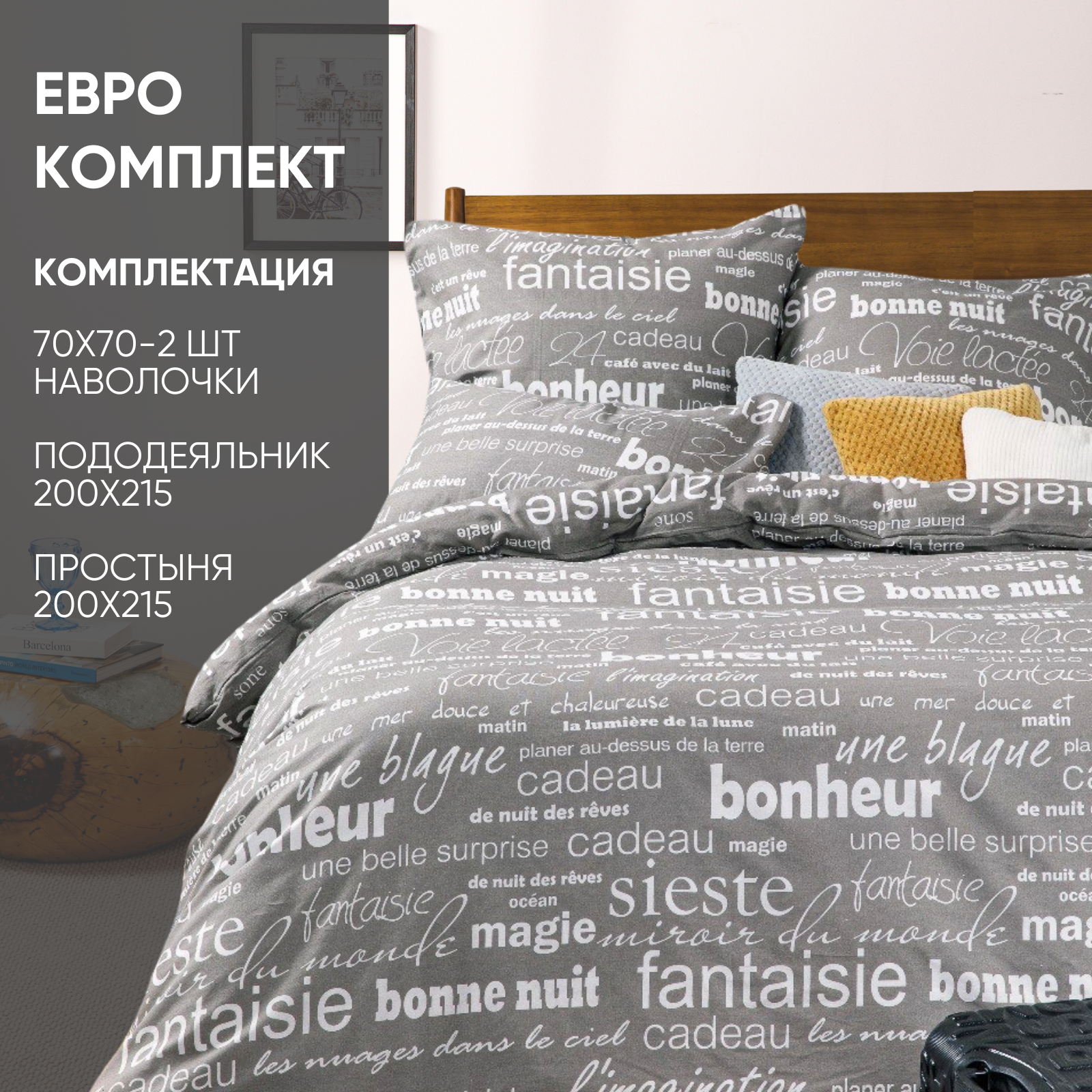 Комплект постельного белья Ночь Нежна Письма, 2-спальное с европростыней, бязь, серый