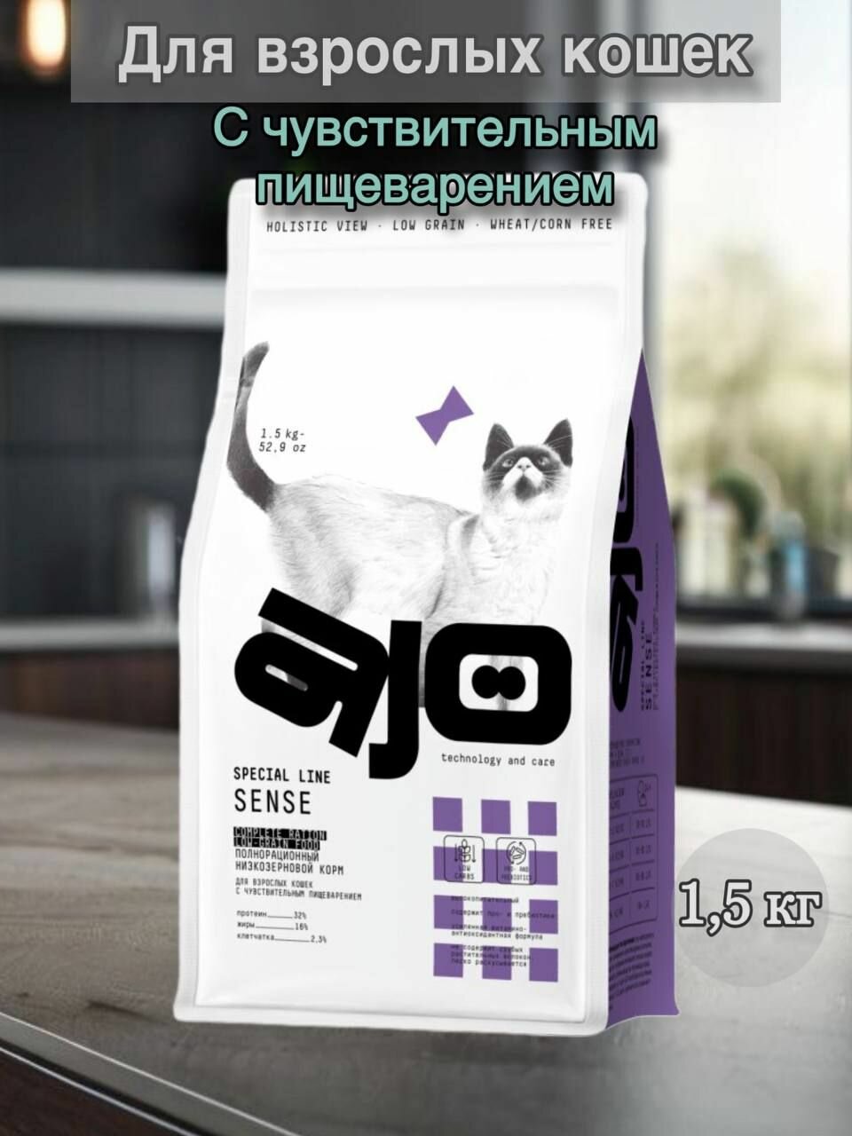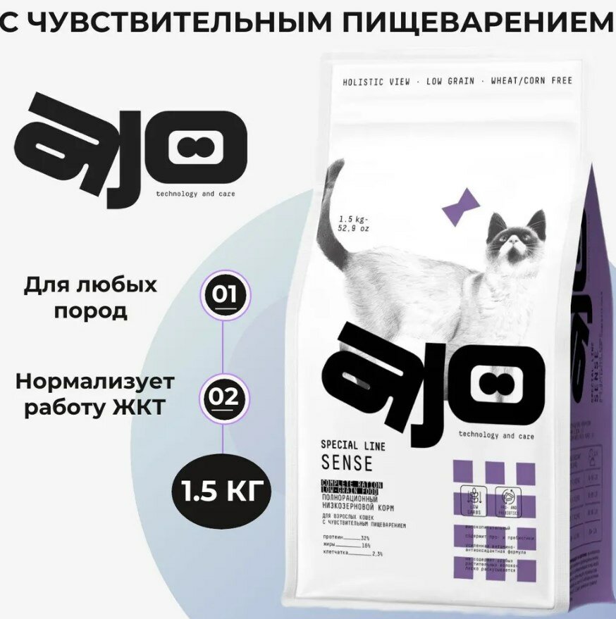 AJO Sense корм низкозерновой для кошек с чувствительным пищеварением 1,5кг