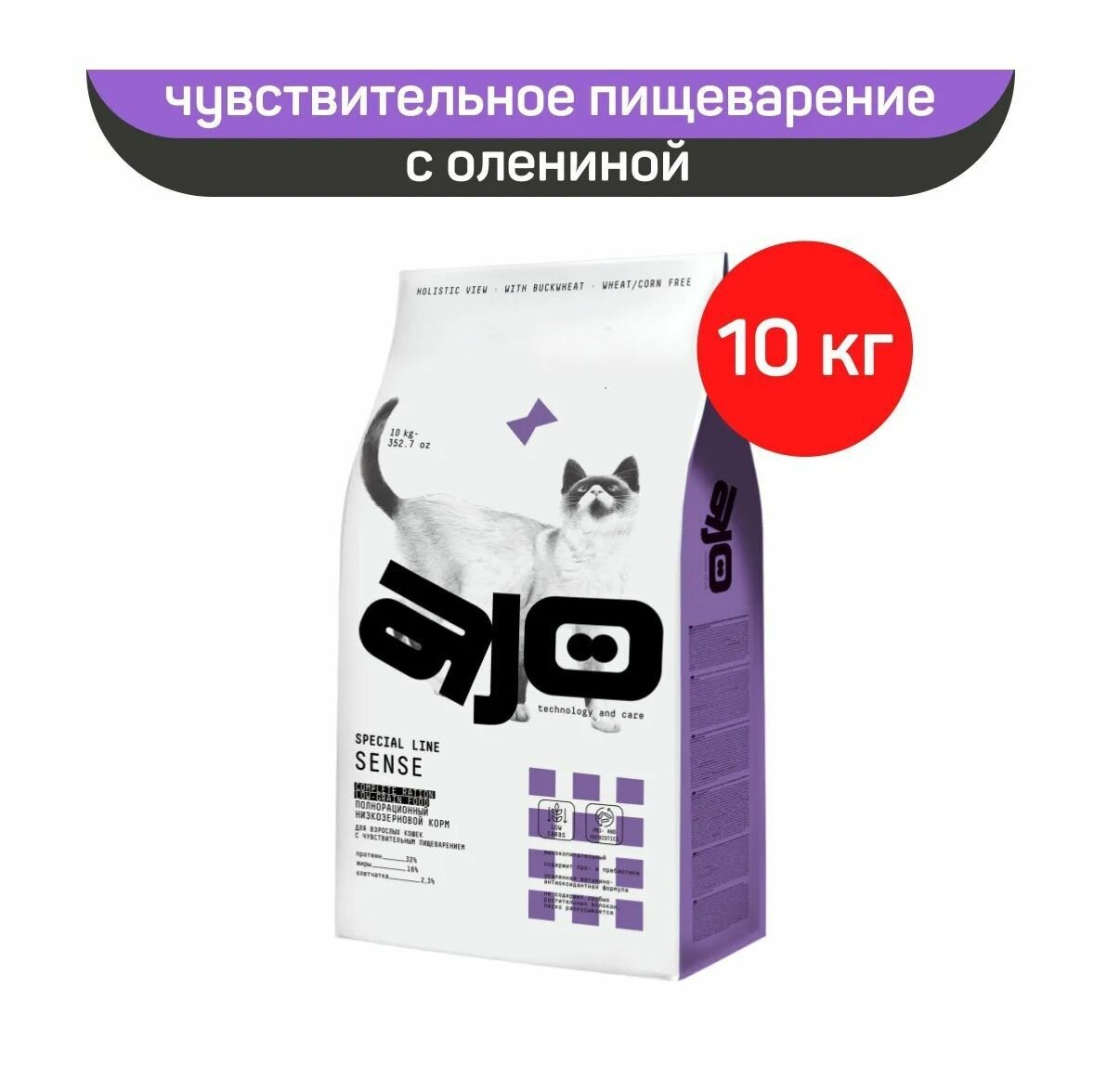 AJO Sense полнорационный корм для кошек с чувствительным пищеварением Курица и оленина, 10 кг.