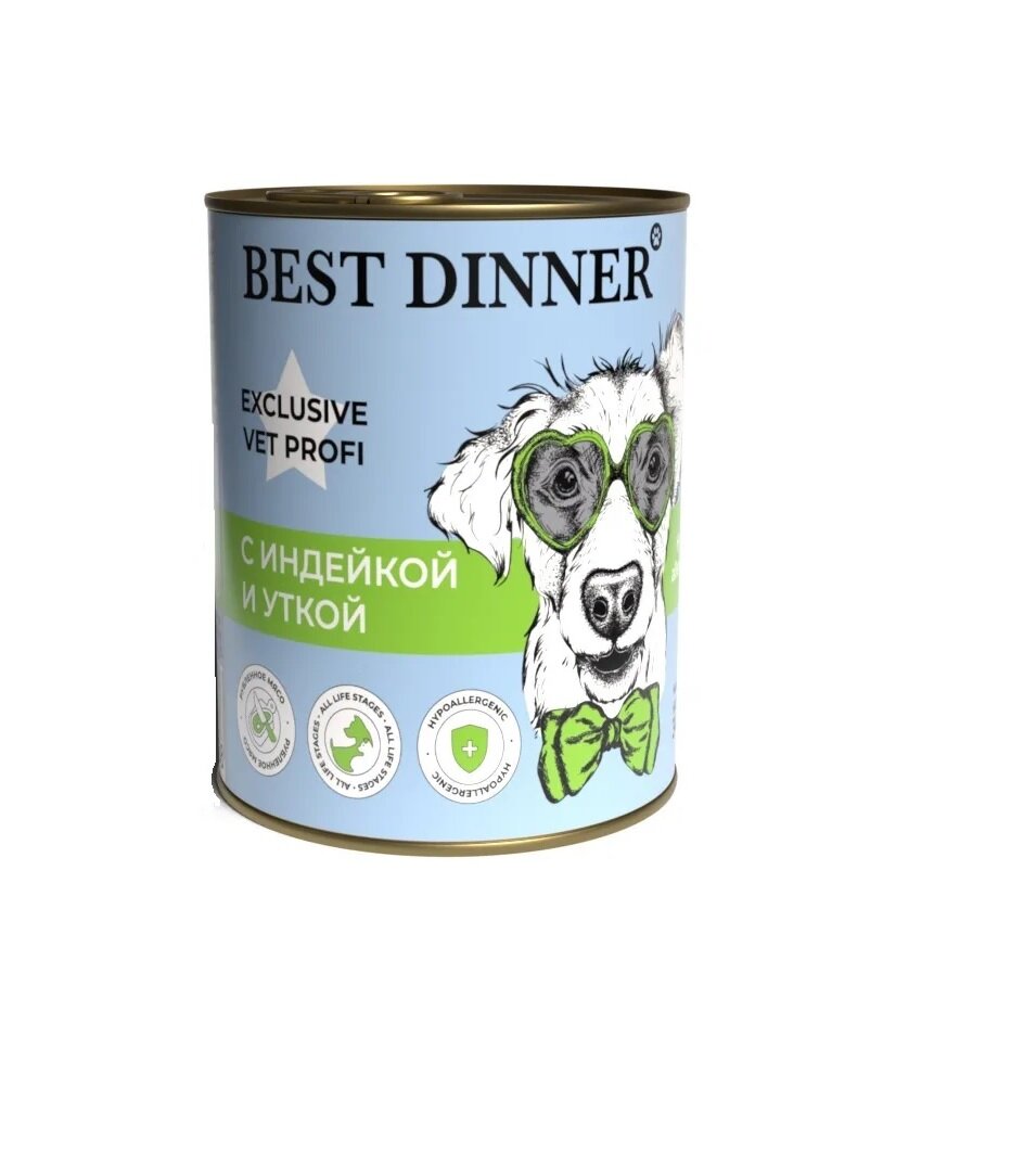 Best Dinner Exclusive Hypoallergenic консервы для собак при проблемах пищеварения с индейкой и уткой - 340 г х 6 шт