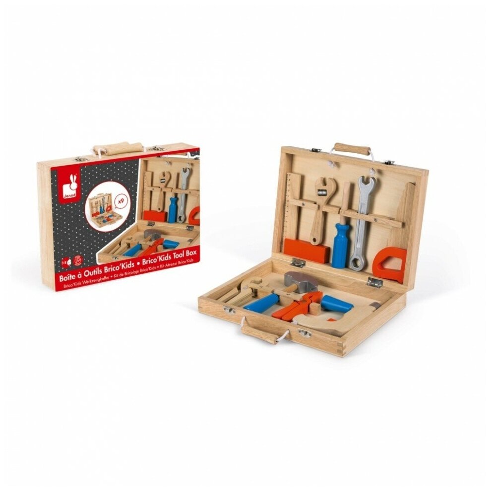 Купить Janod - Ящик для инструментов Brico'Kids, деревянные инструменты для детей, копия игрушки, 9 деталей, от 3 лет, J06481