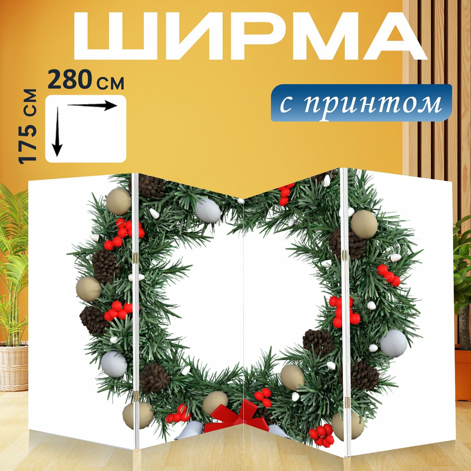 Купить Ширма "Венок, рождественские украшения, украшение" перегородка для зонирования комнаты с принтом 280x175 см. на холсте