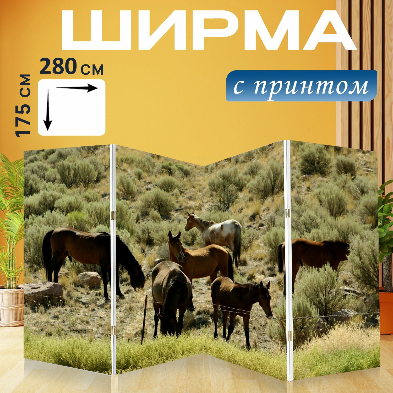 Ширма "Лошади, мустанги, дикие лошади" перегородка для зонирования комнаты с принтом 280x175 см. на холсте интересное: