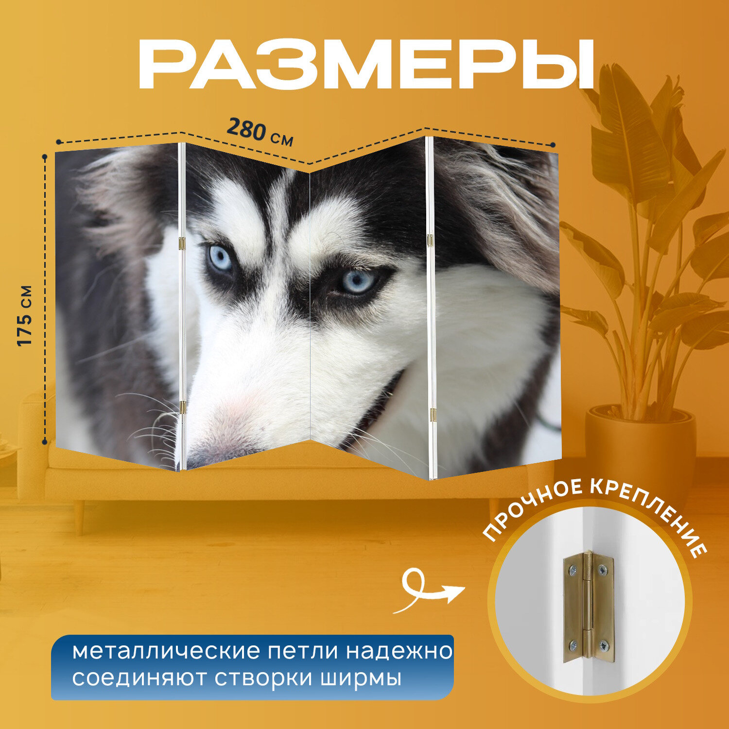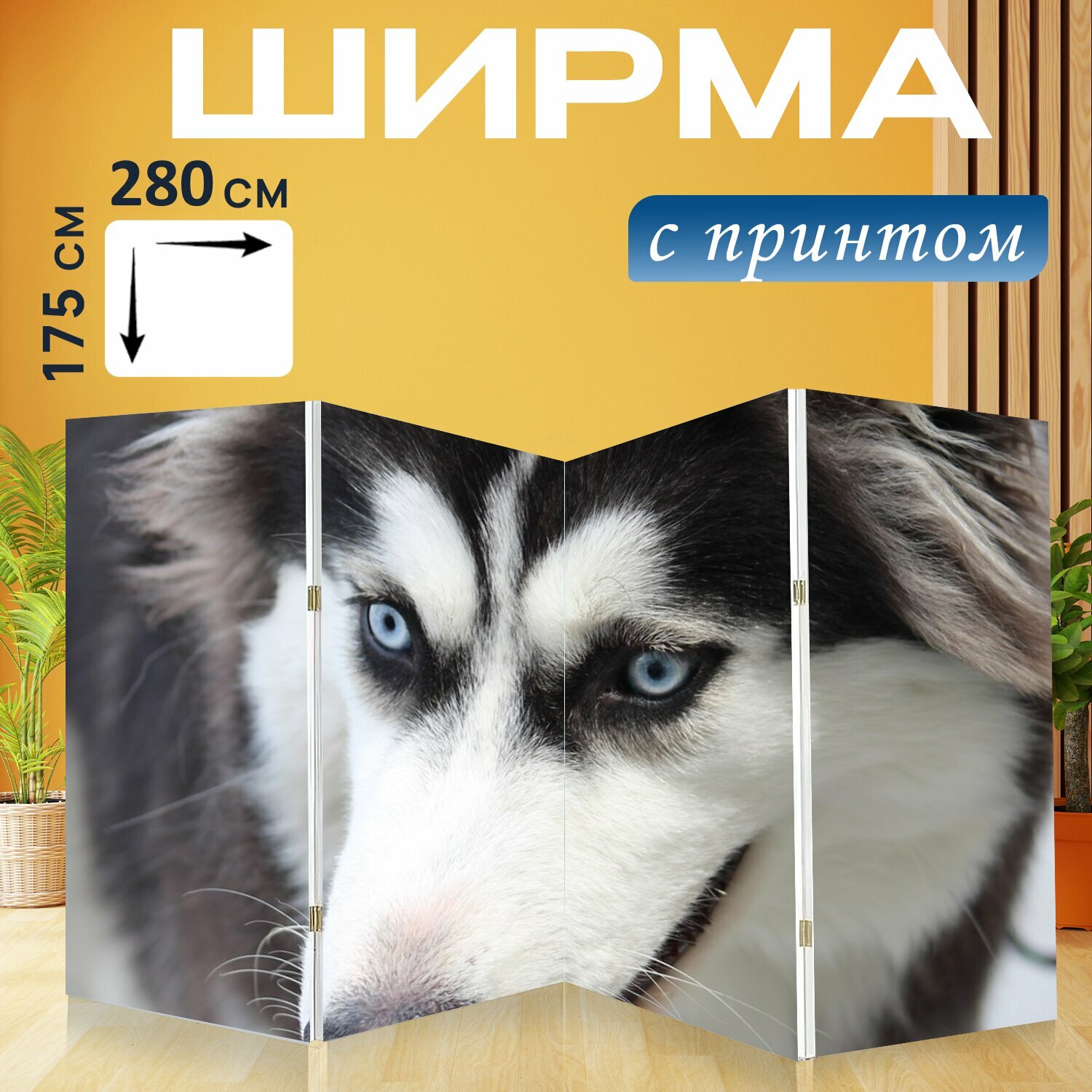 Ширма "Прекрасные глаза, сибирский хаски, портрет собаки" перегородка для зонирования комнаты с принтом 280x175 см. на холсте интересное: