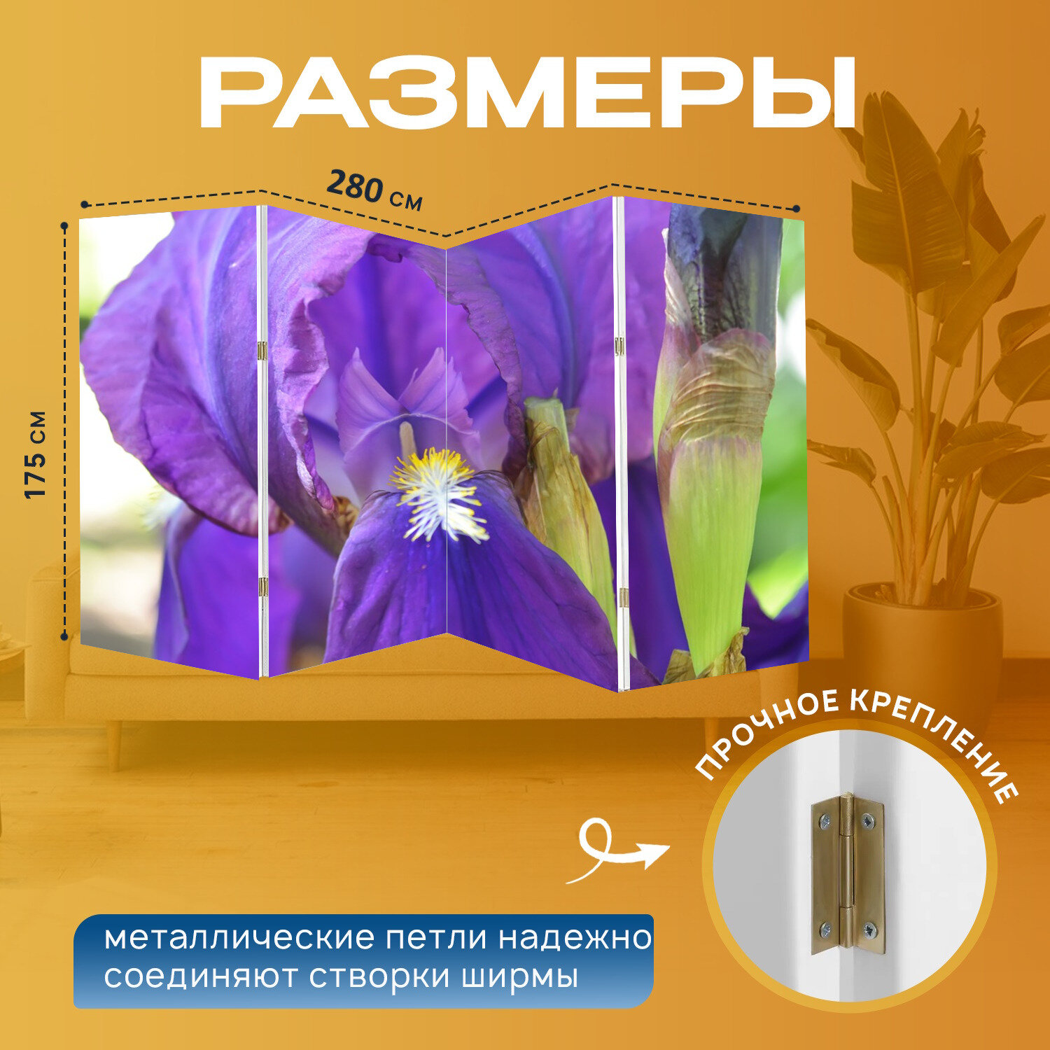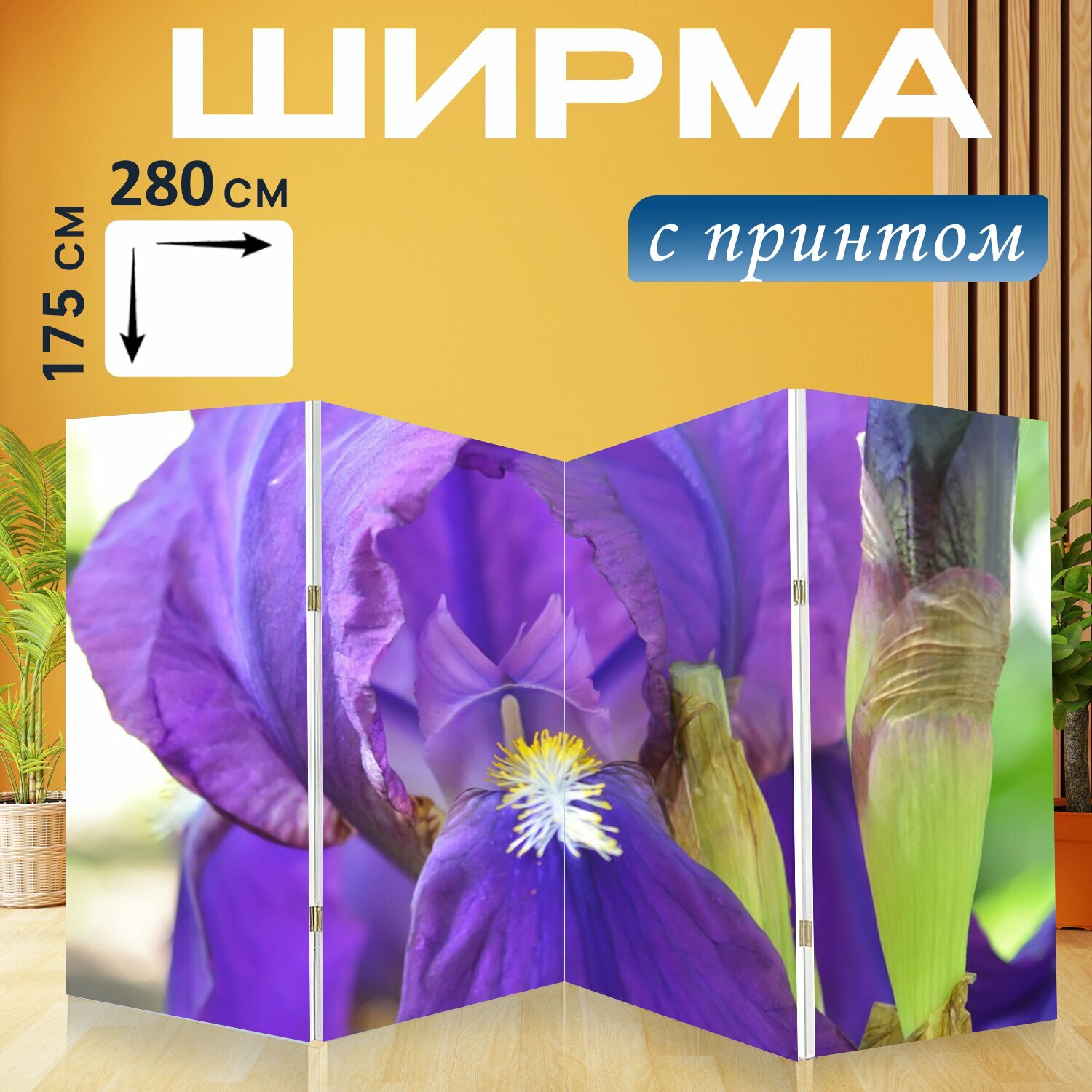 Ширма "Цветы, ирис, фиолетовый" перегородка для зонирования комнаты с принтом 280x175 см. на холсте интересное: