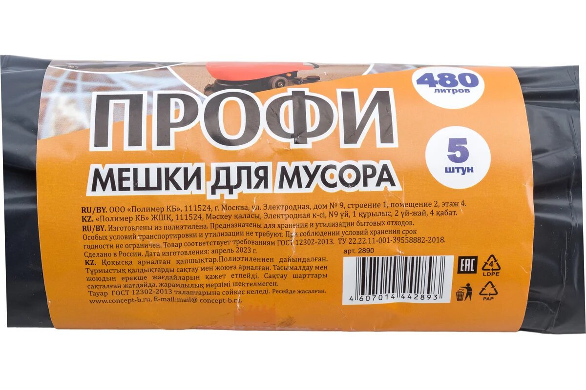 Пакеты для мусора 480л, КБ "Профи" (130х170см, 65мкм) ПВД, 5шт. в рулоне (2890)